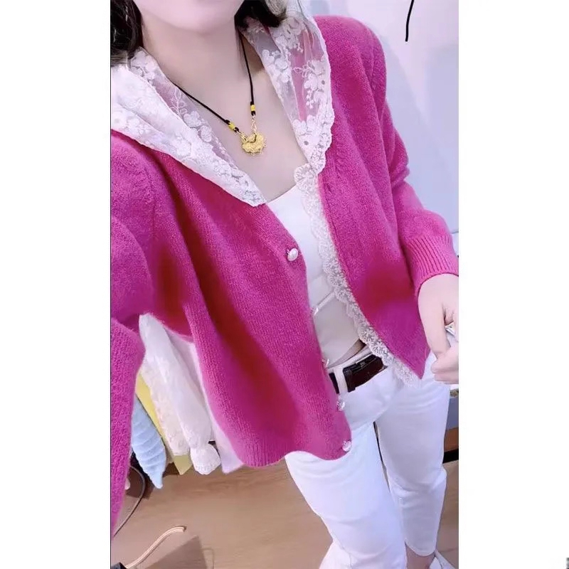 蕾丝长袖拼接开衫秋冬新款连帽洋气针织衫温柔减龄百搭毛衣上衣