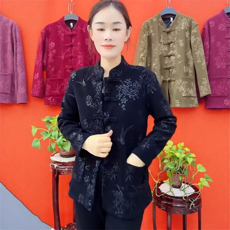 中老年冬季新款加绒保暖外套女宽松遮肚盘扣复古风雪尼尔开衫上衣