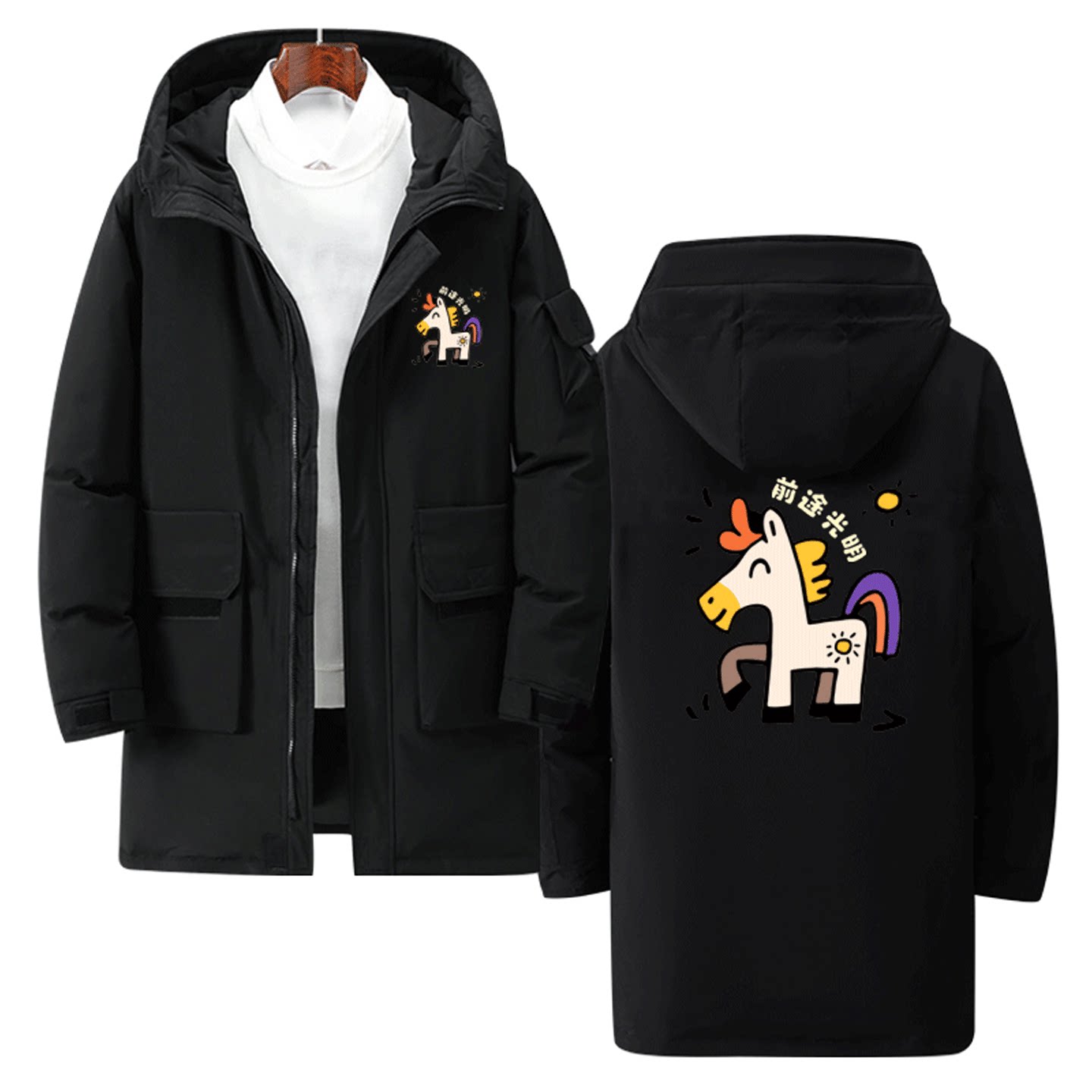 2026马年新年马上有钱卡通情侣可定制中长款羽绒服印花男女秋冬季