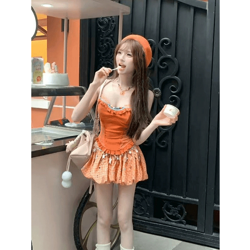 XZY 微胖多巴胺辣妹桔色串珠吊带上衣女25年夏季显瘦花苞短裙套装