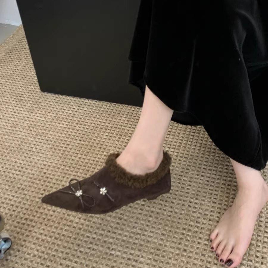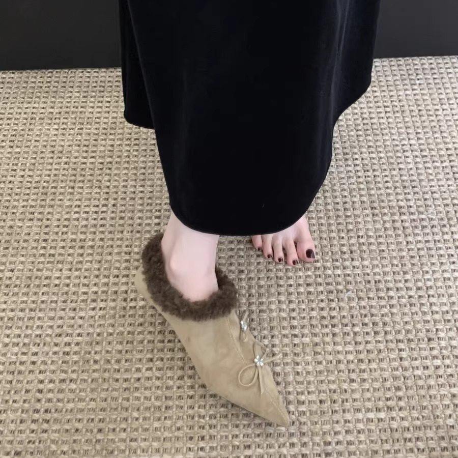 毛毛鞋女蝴蝶结水钻尖头平底单鞋加绒保暖一脚蹬懒人鞋