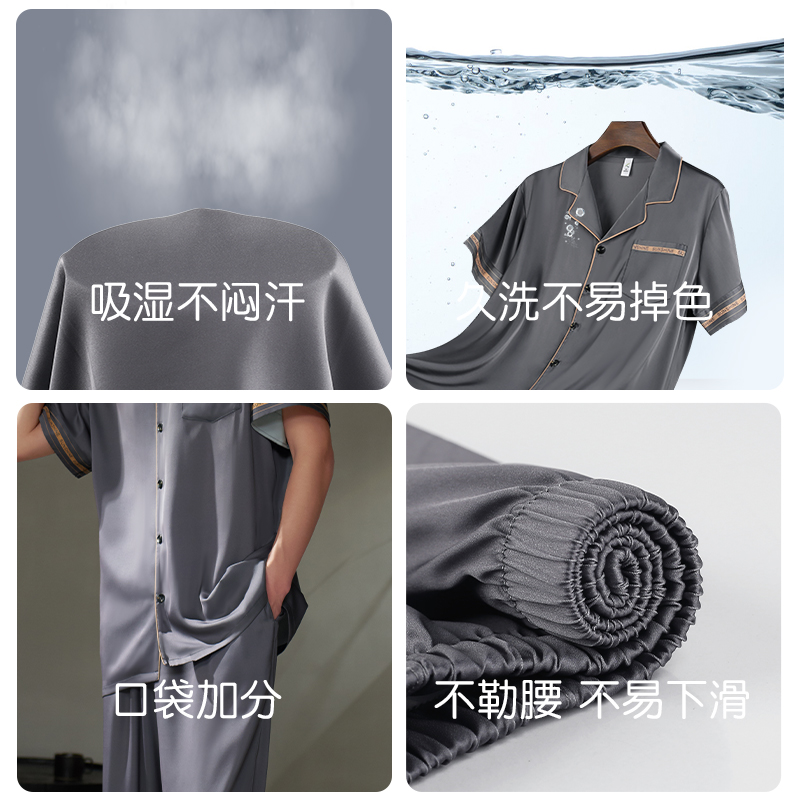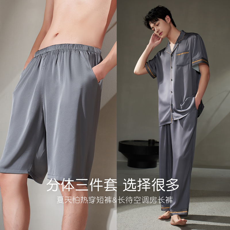 轩靓睡衣男夏季薄款短袖短裤长裤冰丝绸三件套装仿真丝大码家居服