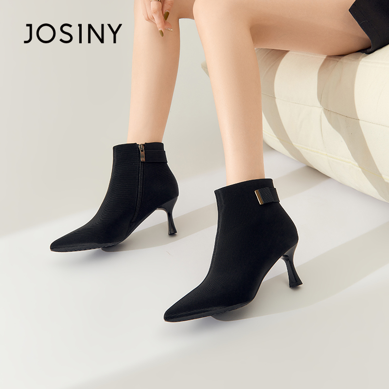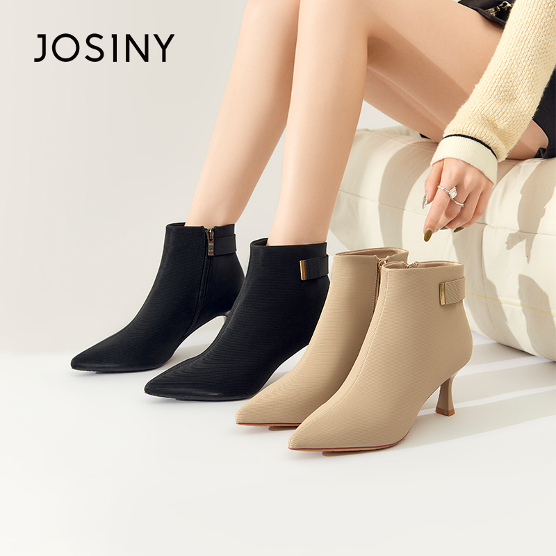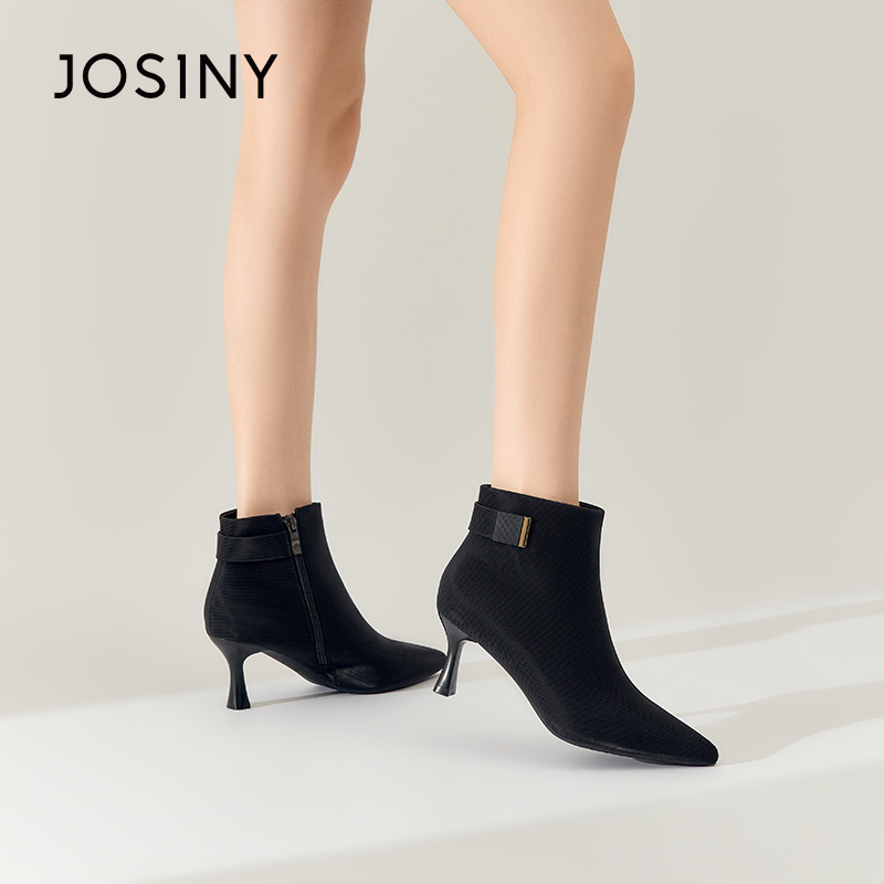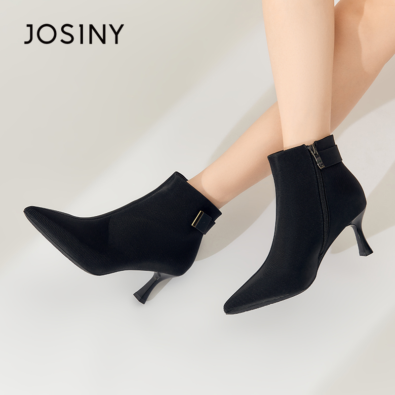 卓诗尼冬季新款女时装靴加绒保暖舒适尖头细跟气质通勤百搭英伦风