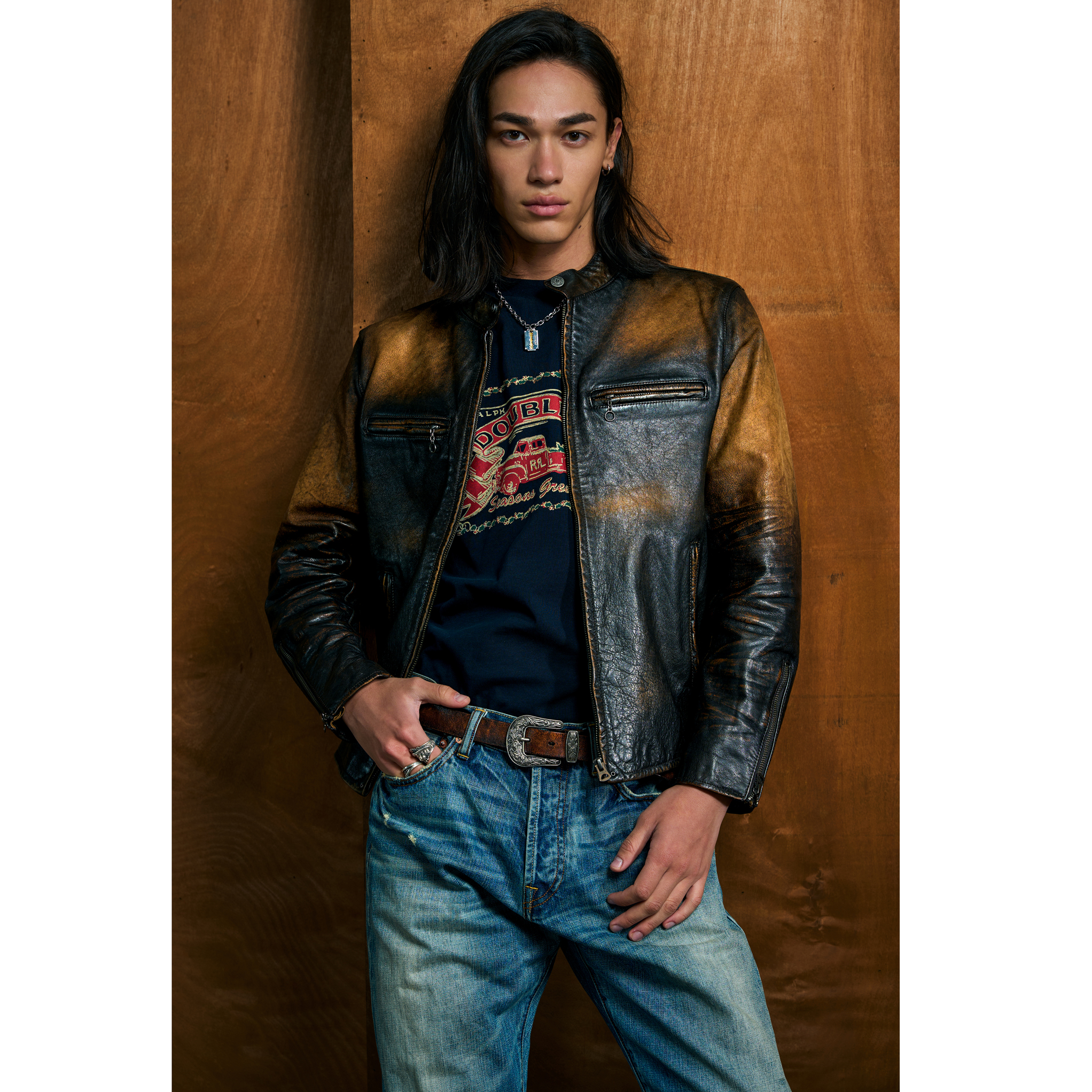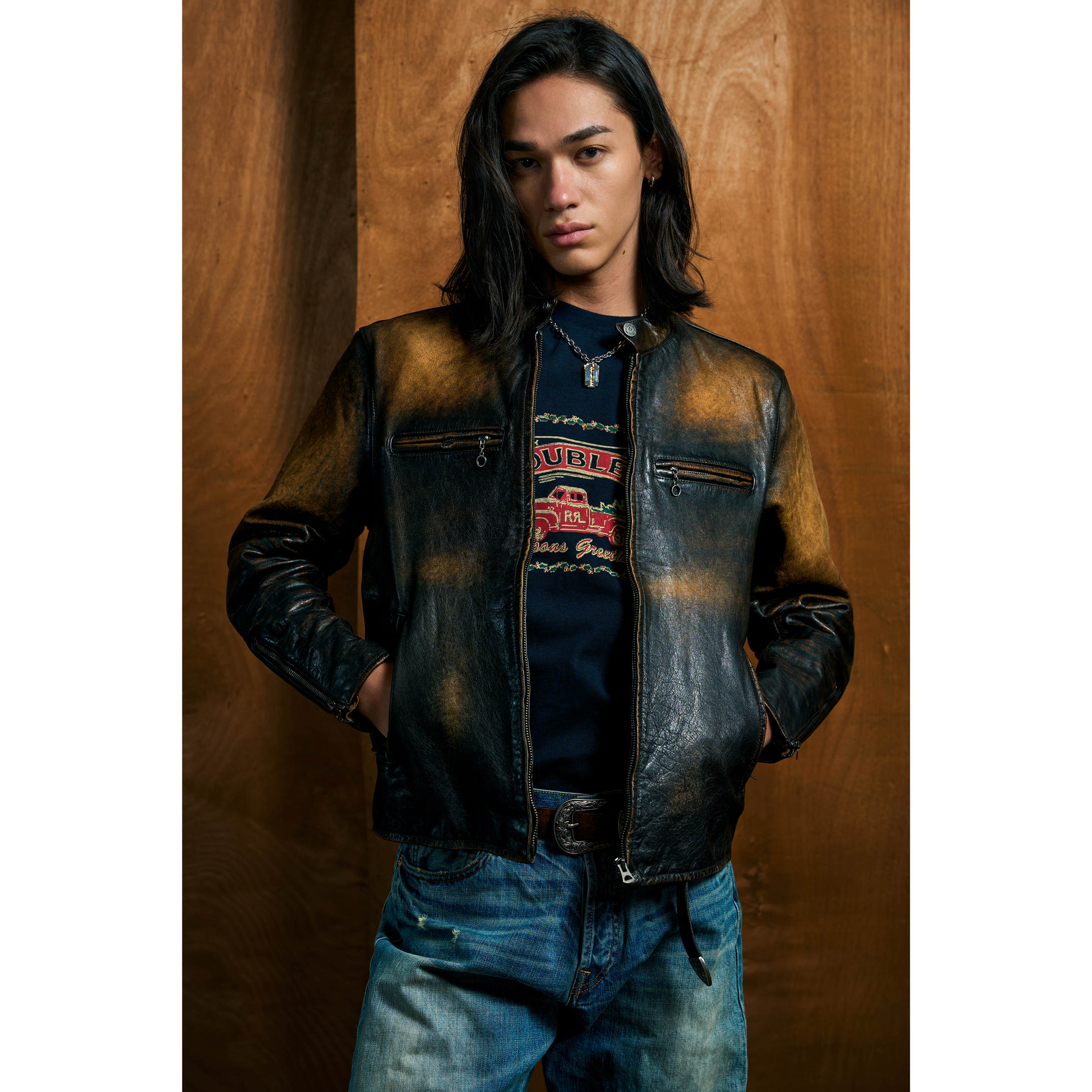 特叔复古男装J100修身机车皮夹克真皮皮衣男做旧茶芯牛皮立领外套