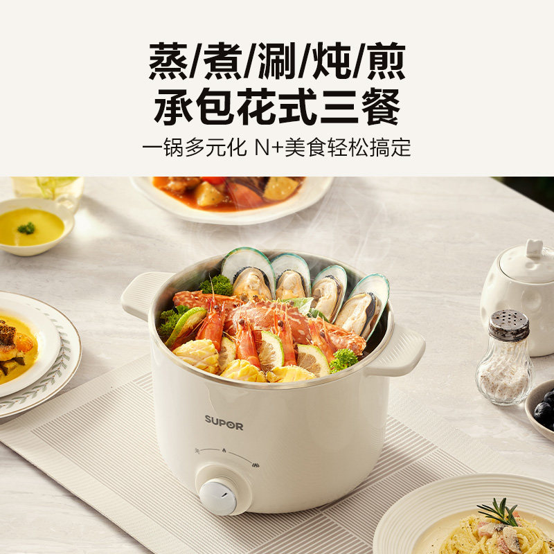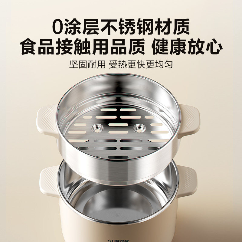苏泊尔电煮锅家用宿舍小型泡面锅蒸煮一体多功能0涂层不锈钢火锅