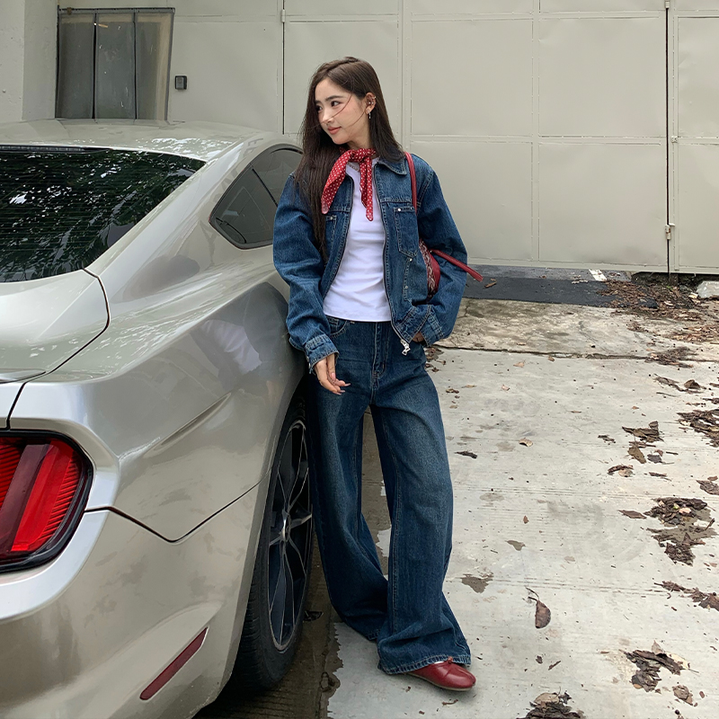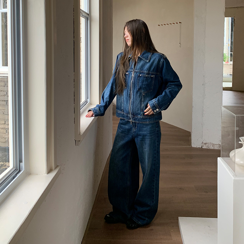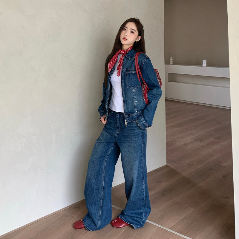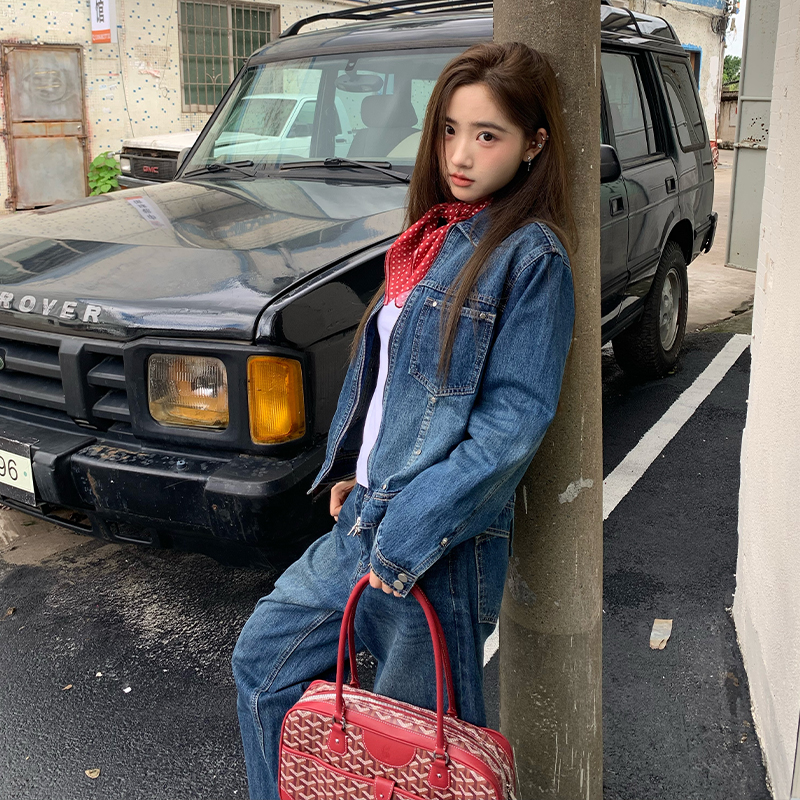 【限时价】橘子树在哪儿复古牛仔套装女秋翻领外套拖地裤子两件套