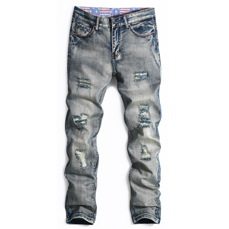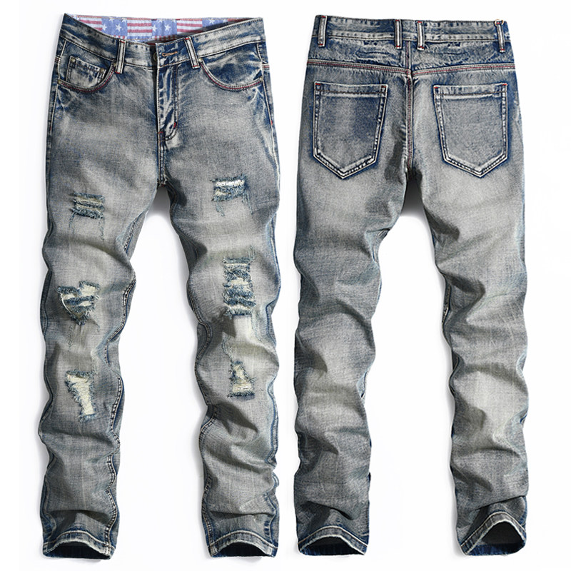 欧美原创男士直筒破洞牛仔裤怀旧潮流青年休闲修身长裤复古乞丐裤