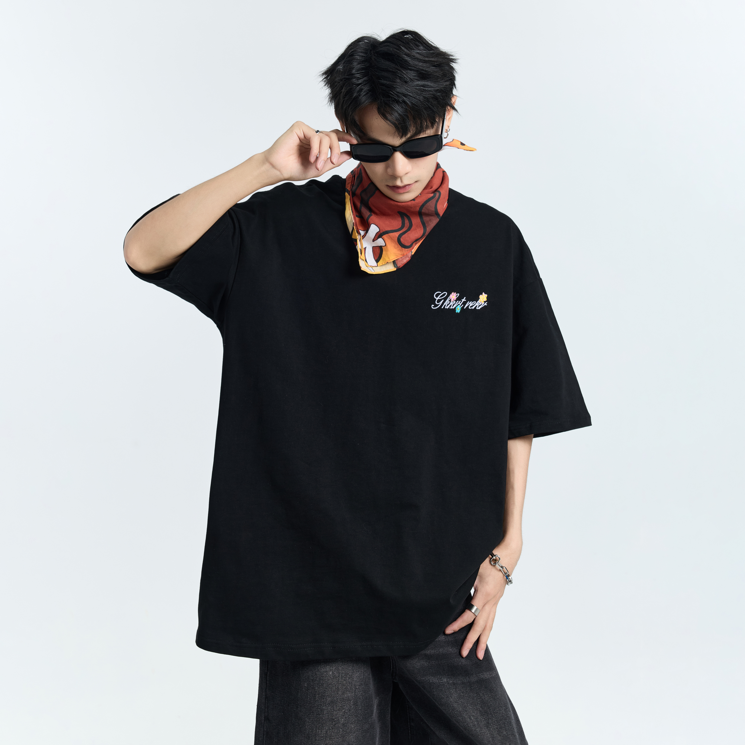GKKRT潮牌手写花卉刺绣短袖T恤男女款美式宽松重磅复古情侣上衣服