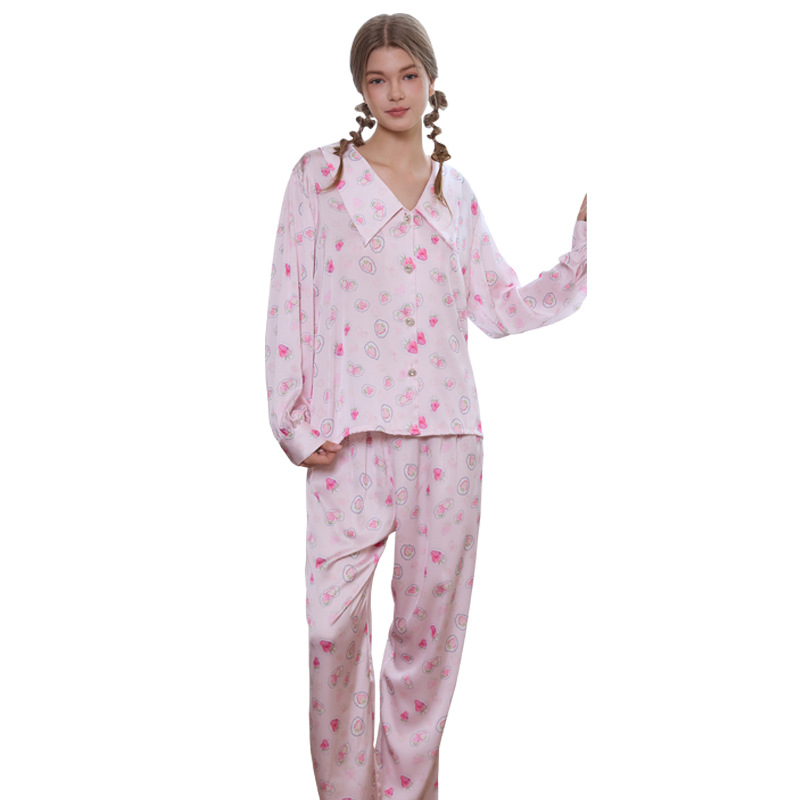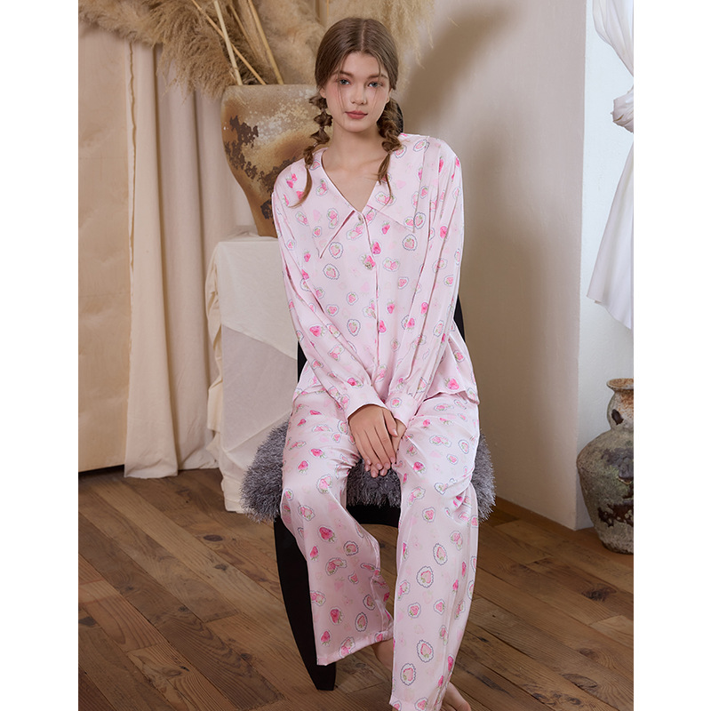 甜美风爱心钻扣甜美长袖翻领冰丝睡衣女士薄款仿真丝绸家居服套装