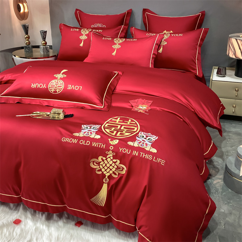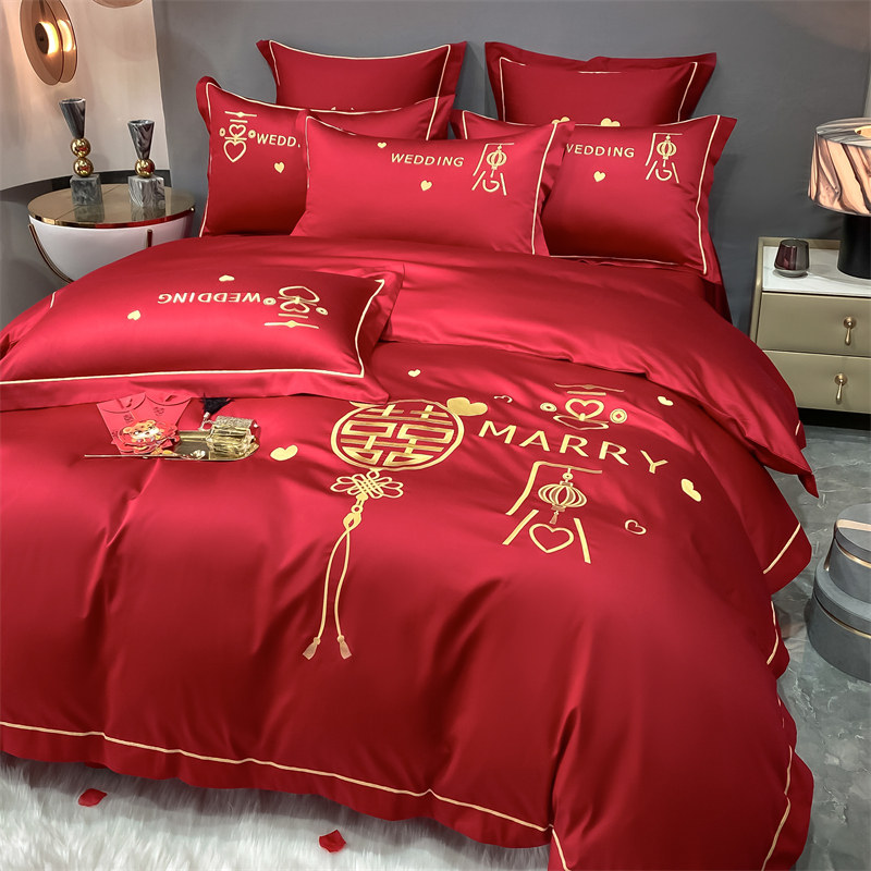 大红色高档婚庆四件套全水洗棉纯色被套床单婚房结婚喜庆床上用品
