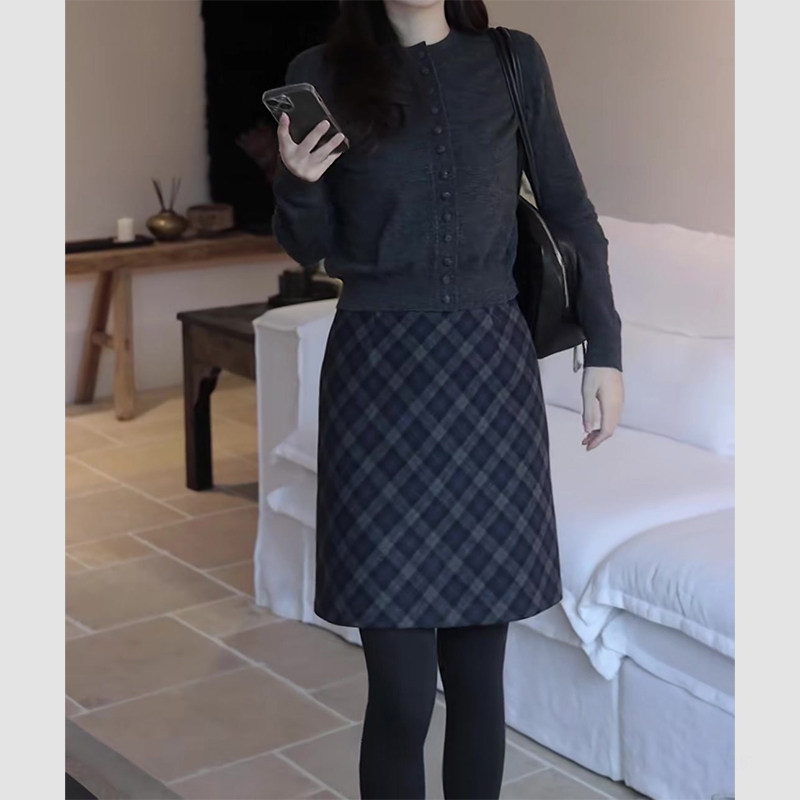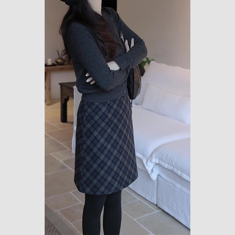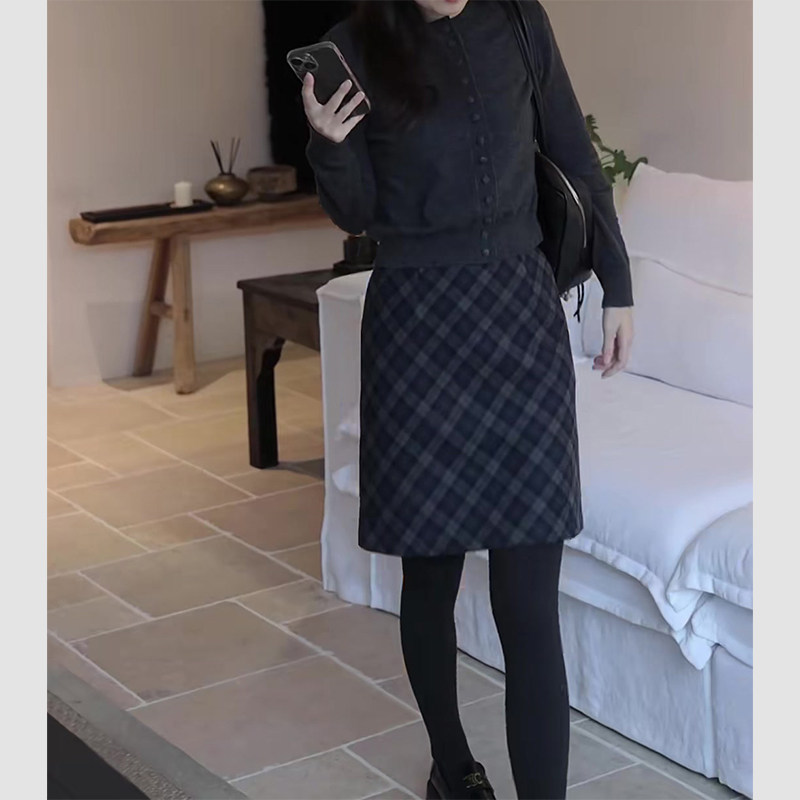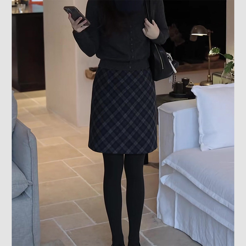 复古轻奢格纹毛呢半身裙女生2025