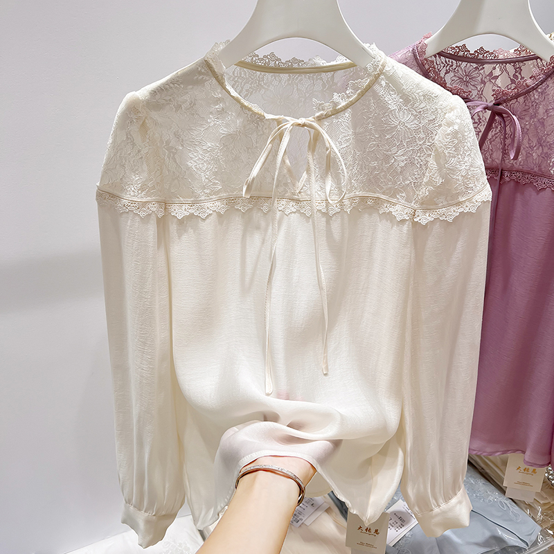2025新款法式气质显瘦蕾丝拼接系带镂空套头长袖雪纺衫女秋季