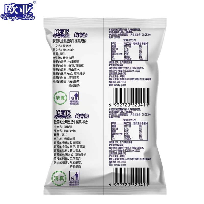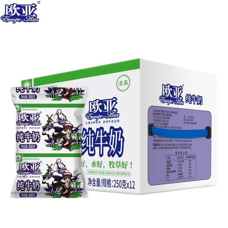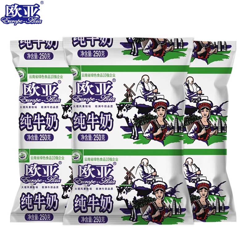【日期新鲜】大理欧亚高原全脂纯牛奶袋装250g*12袋/箱早餐纯牛奶