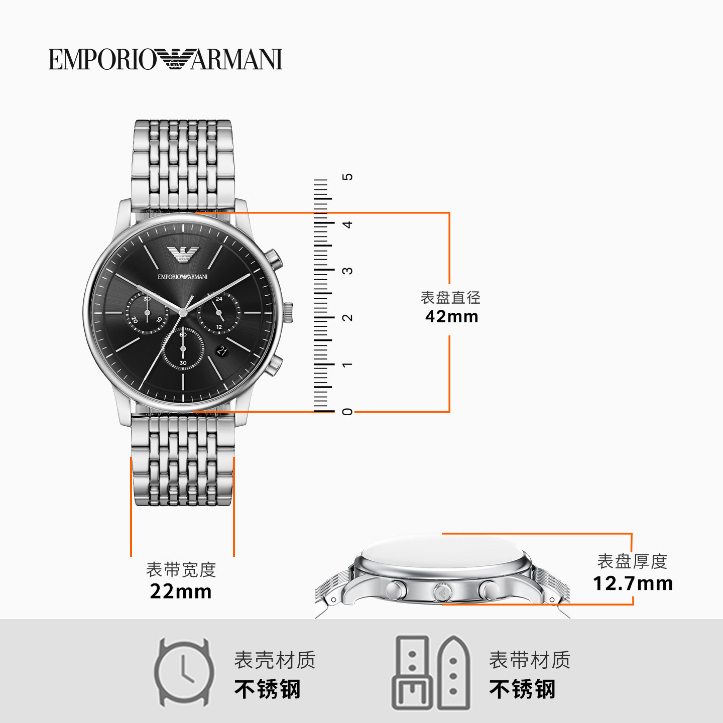 阿玛尼男士大表盘钢带石英腕表