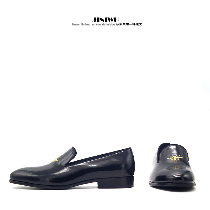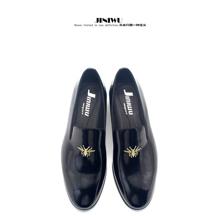 JINIWU吾倪季2025小蜜蜂乐福鞋亮皮黑色简约头层牛皮男鞋套脚皮鞋