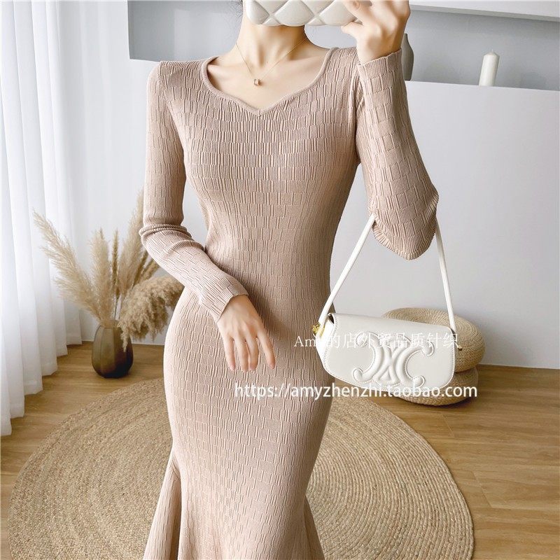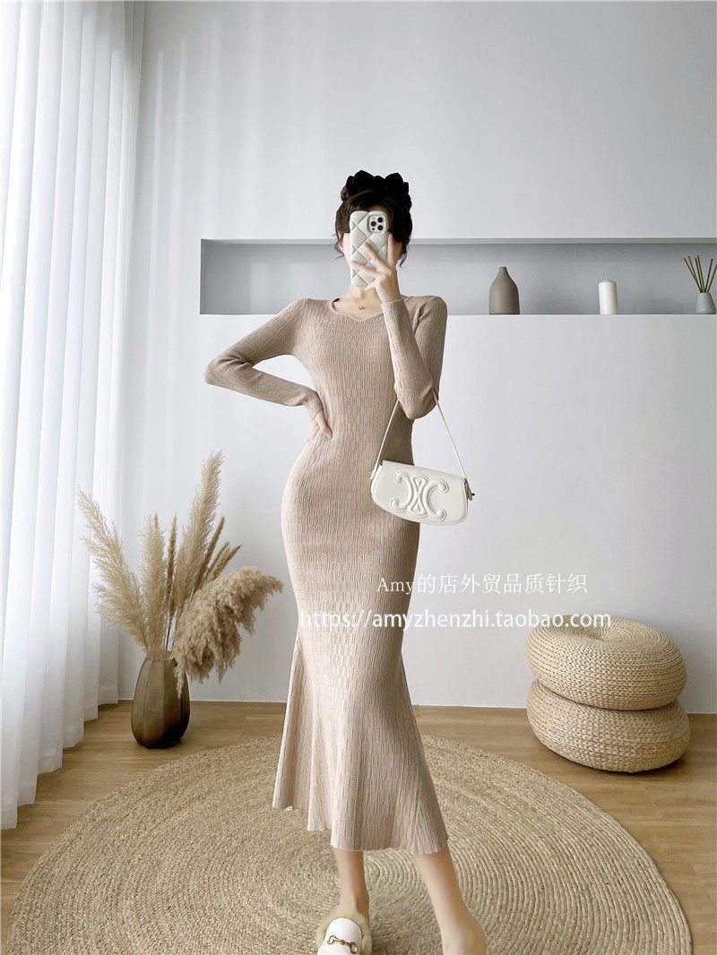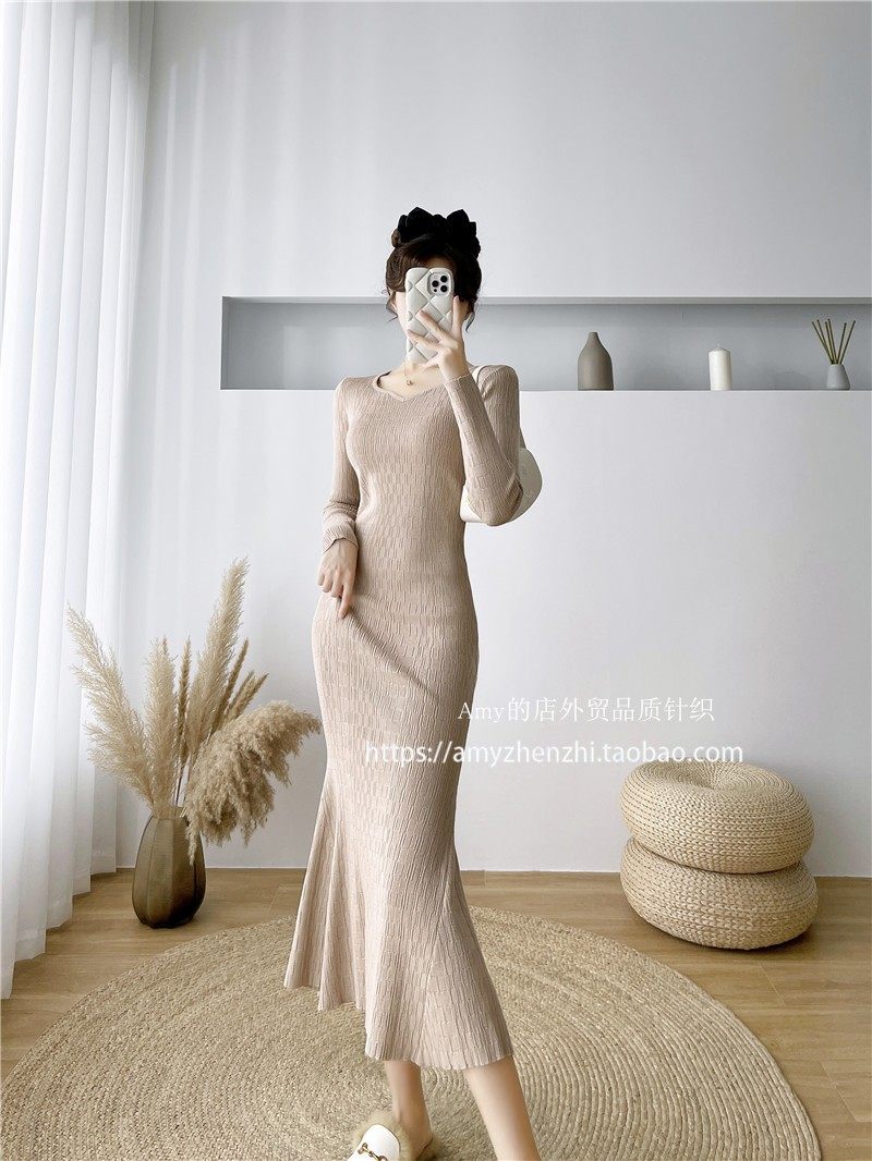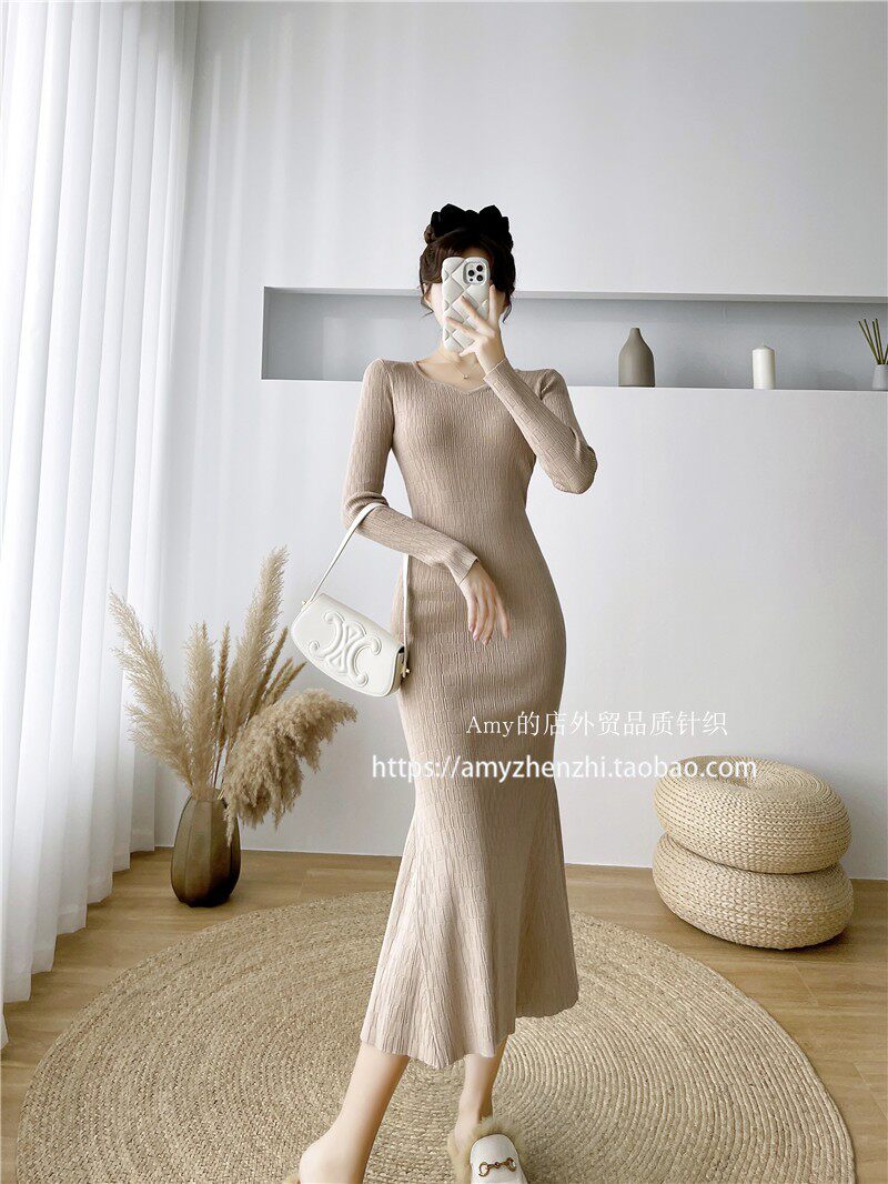 2023新款针织连衣裙长款修身显瘦内搭裙子秋冬长袖包臀鱼尾裙长裙
