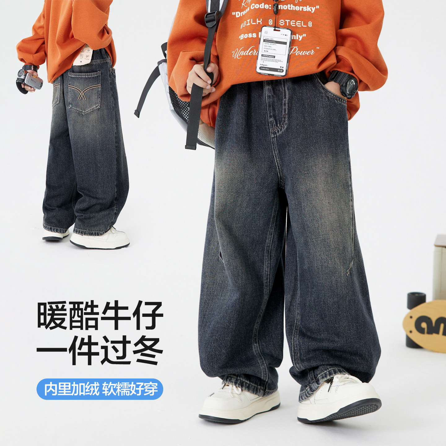 男童秋冬阔腿加绒弯刀牛仔裤2025新款青少年儿童加厚宽松直筒裤子