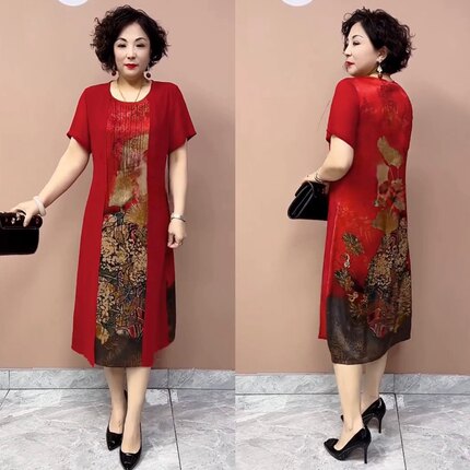 中老年夏装假两件妈妈短袖连衣裙重磅真丝桑蚕丝时尚烫钻长裙子女