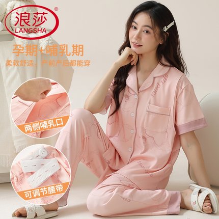 浪莎月子服夏季薄款短袖长裤睡衣女款纯棉大码哺乳孕妇家居服套装