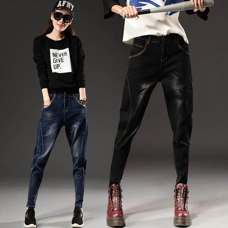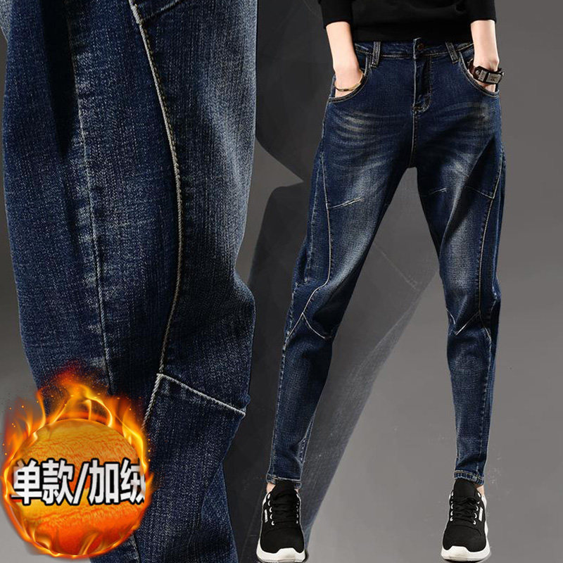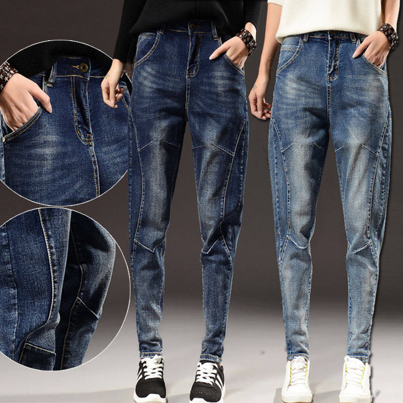 高腰深蓝色哈伦裤牛仔裤女韩版大码胖MM长裤宽松萝卜裤2021春新款