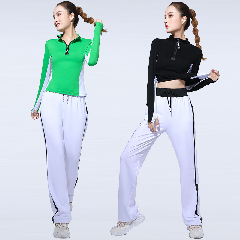 日本品质广场舞服装女棉质拼接撞色半拉链领上衣跳健身操衣服中老