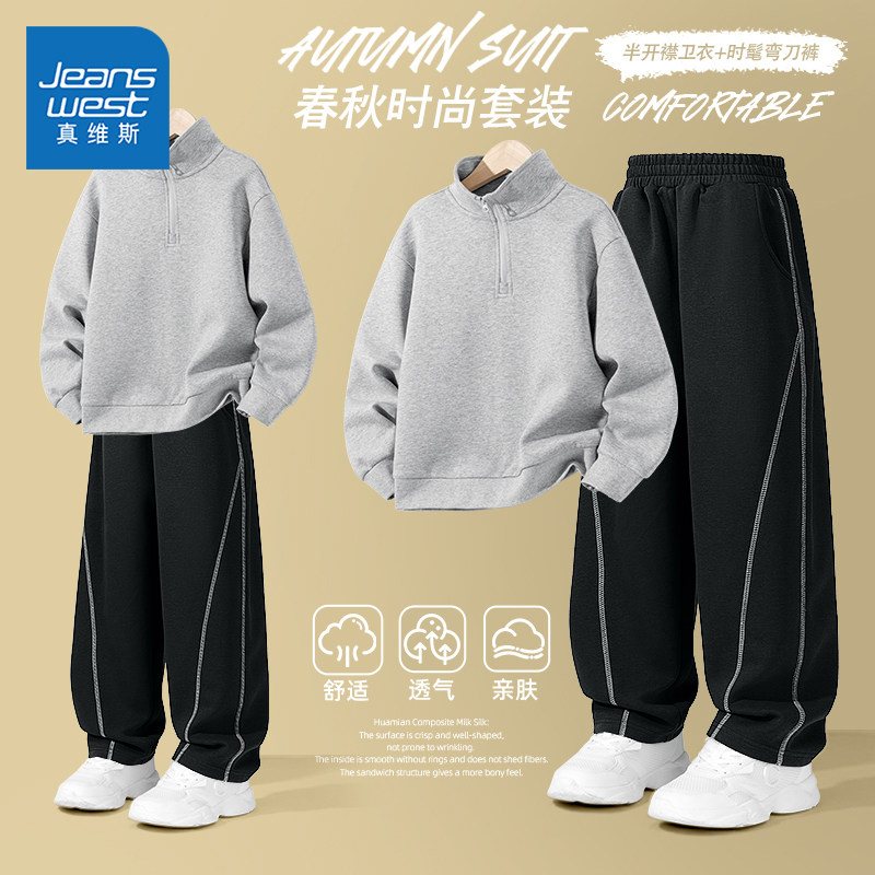 真维斯童装男童春季套装中大童红色加绒运动卫衣男孩时尚两件套潮