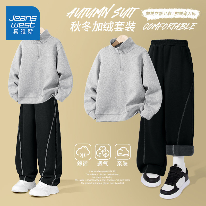 真维斯童装男童冬季套装中大童红色加绒运动卫衣男孩时尚两件套潮