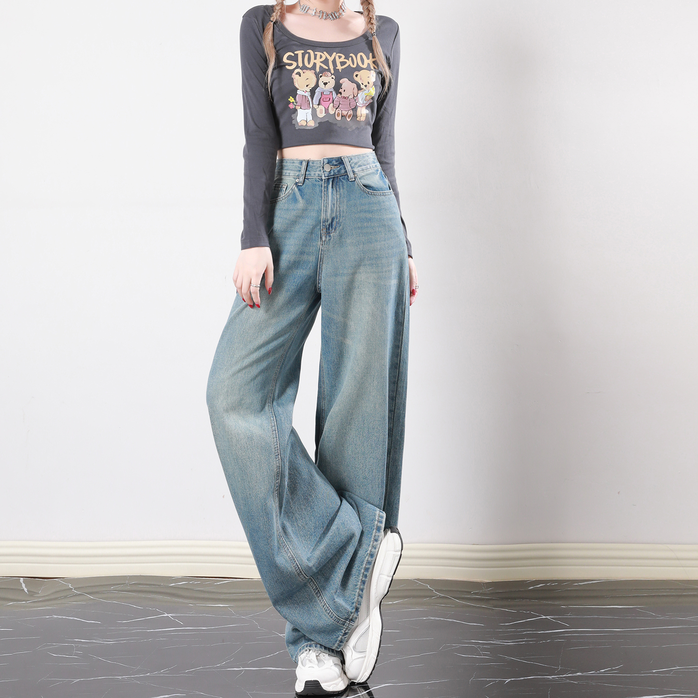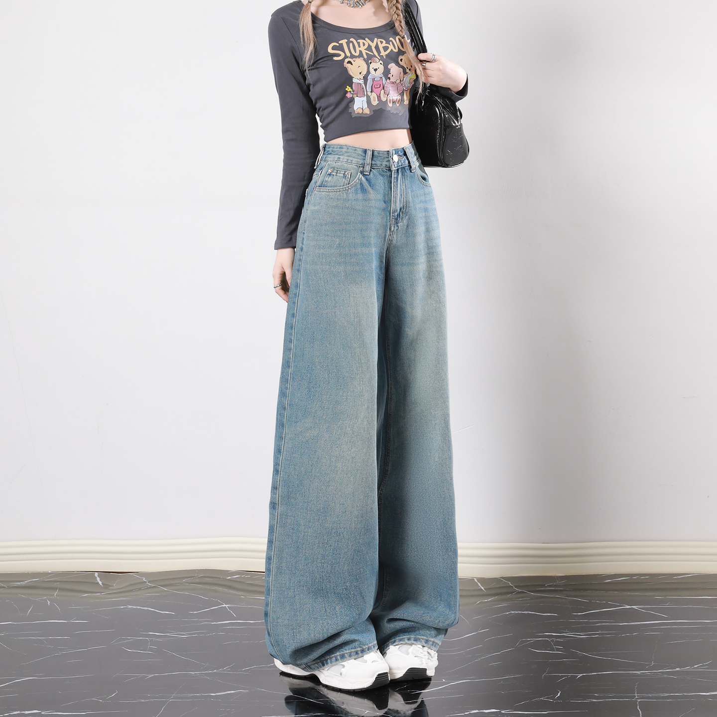 艾格蓝色高腰遮肉显瘦阔腿牛仔裤
