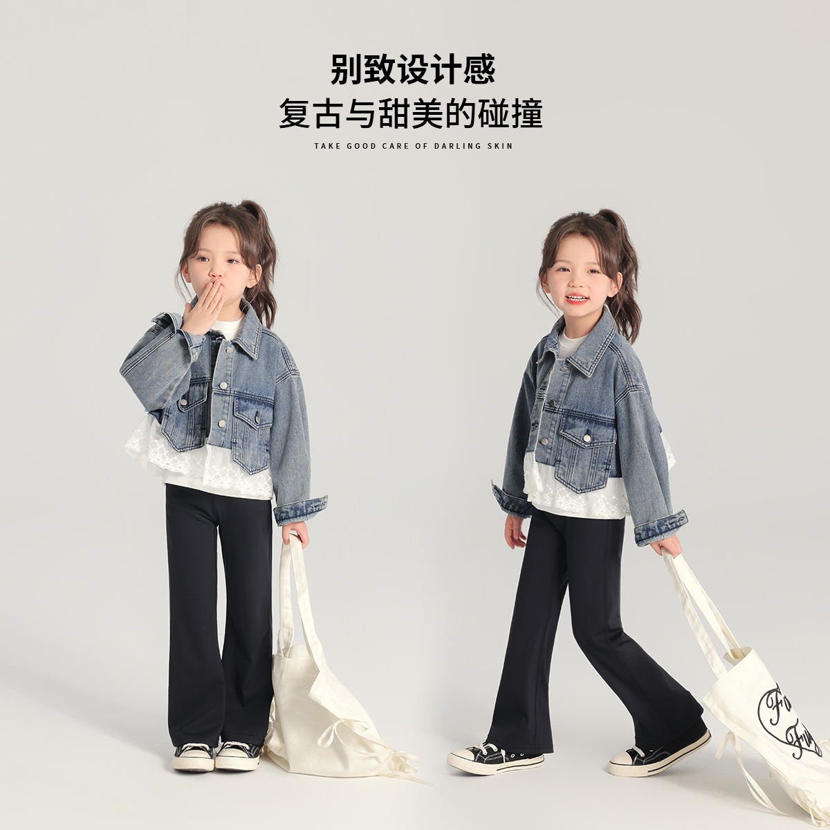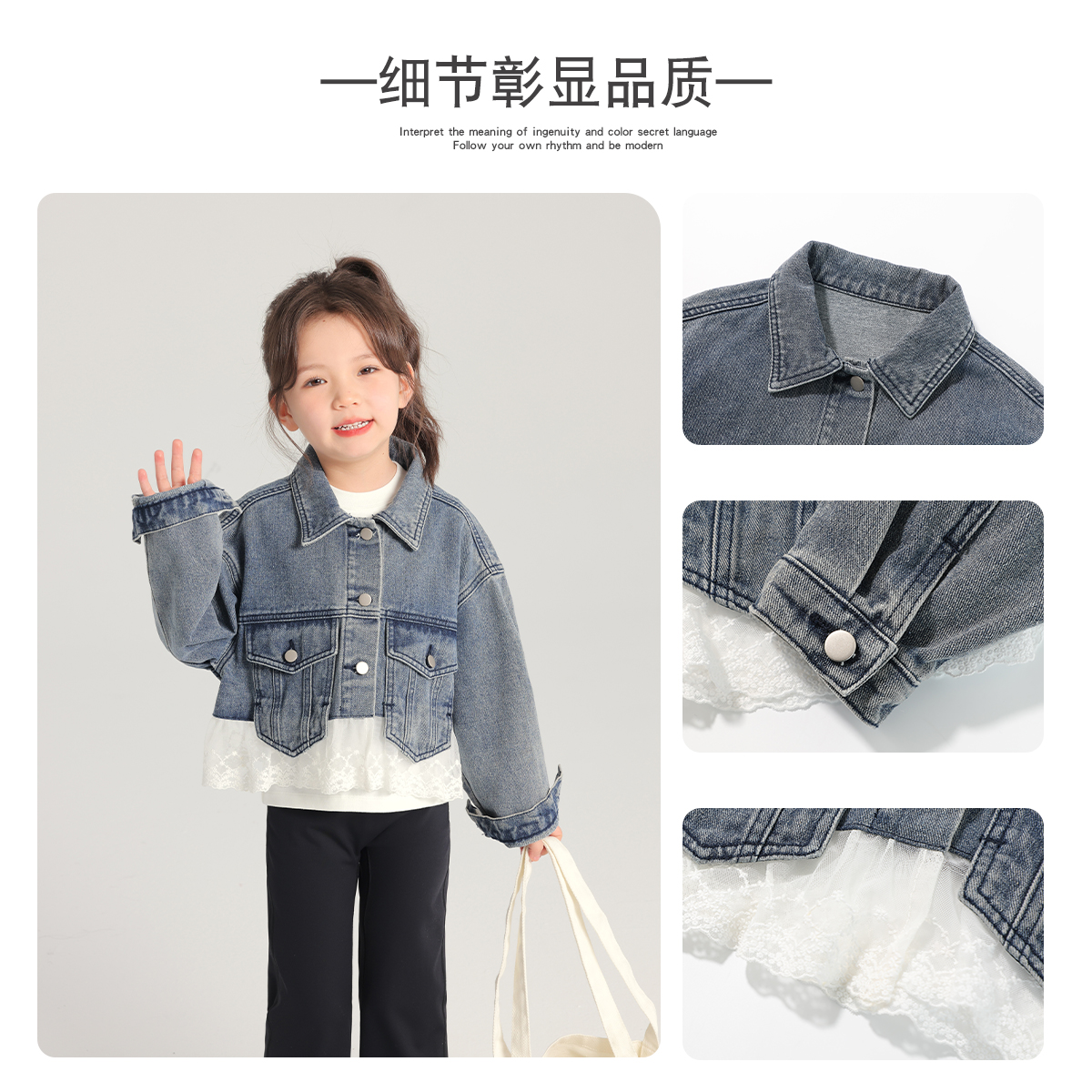 布丁哈鲁春装女童上衣2025春秋新款儿童百搭蕾丝花边牛仔外套