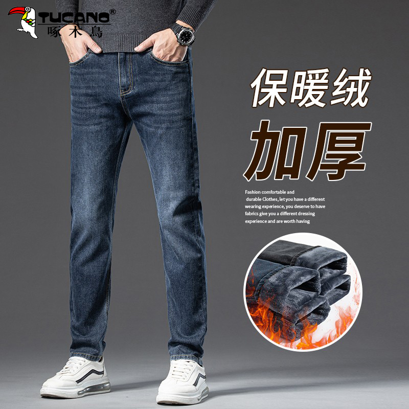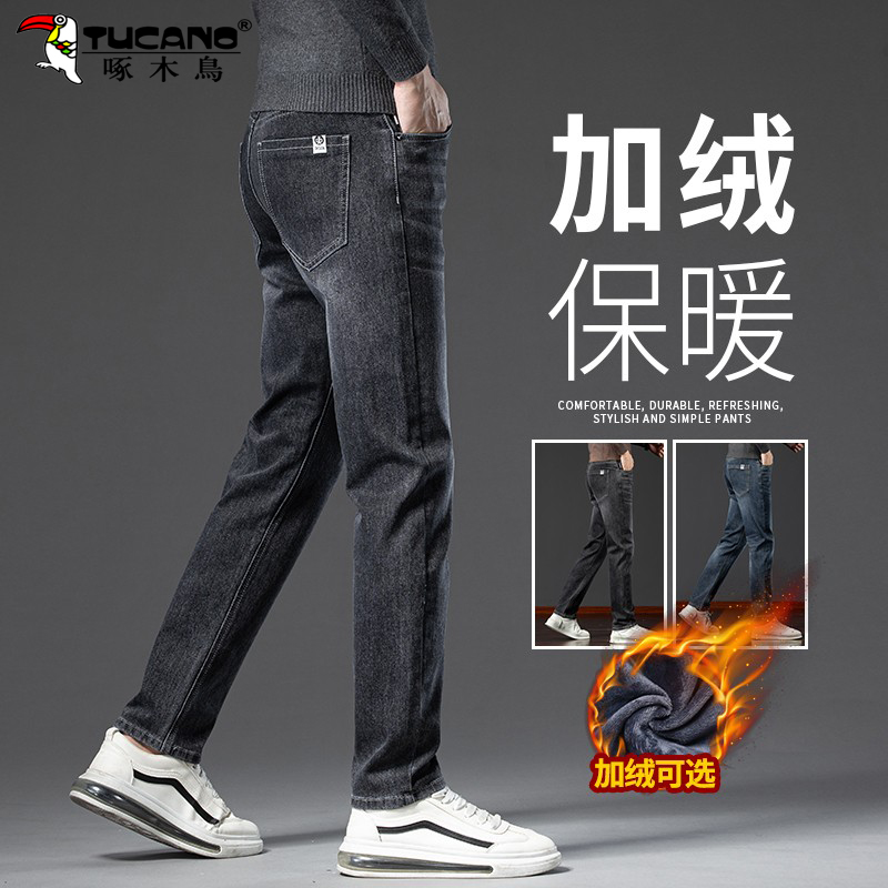 啄木鸟2025秋冬款男士休闲裤子韩版修身直筒小脚加绒加厚牛仔裤男