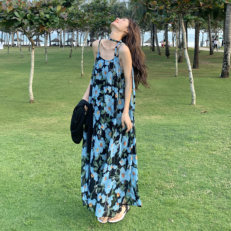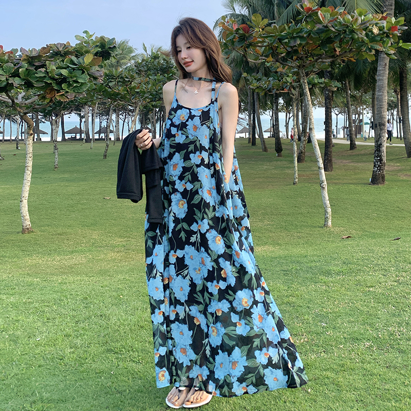 海边度假蓝色碎花吊带连衣裙女夏新款超好看显瘦气质雪纺沙滩裙