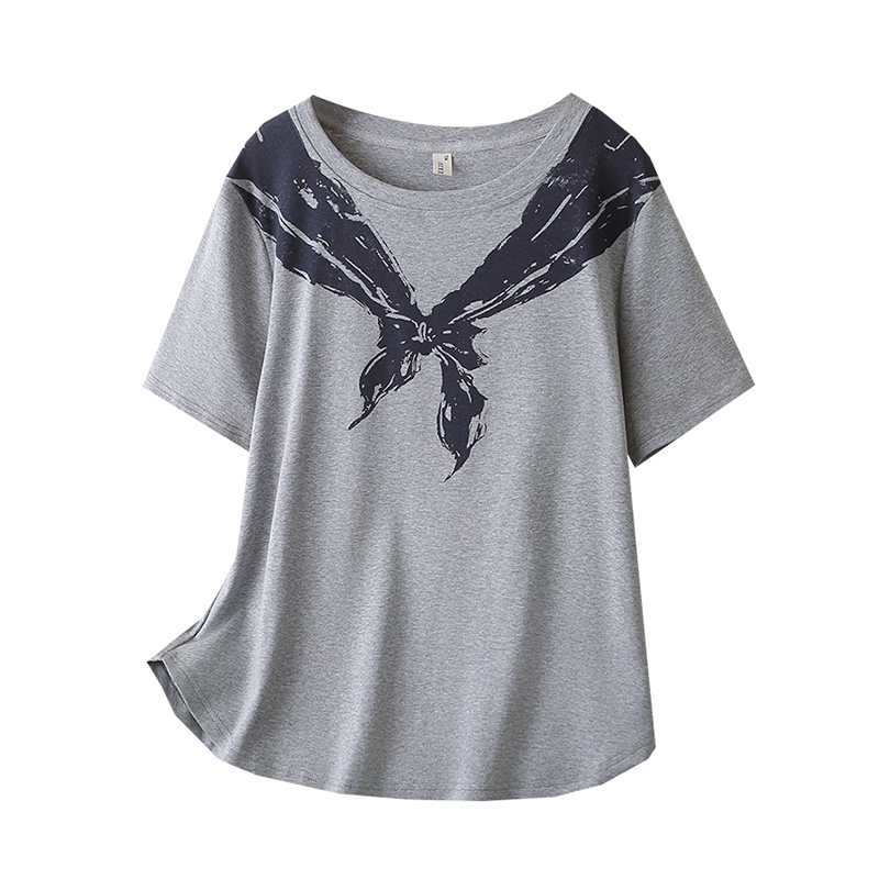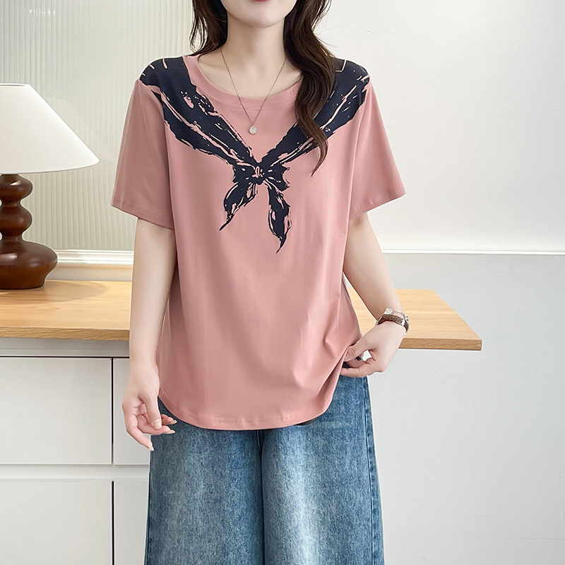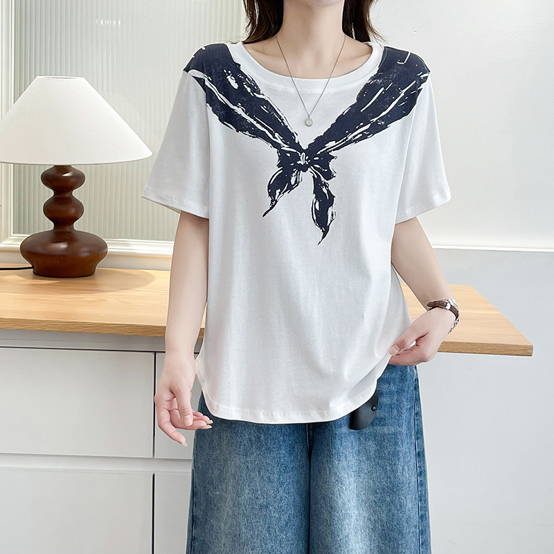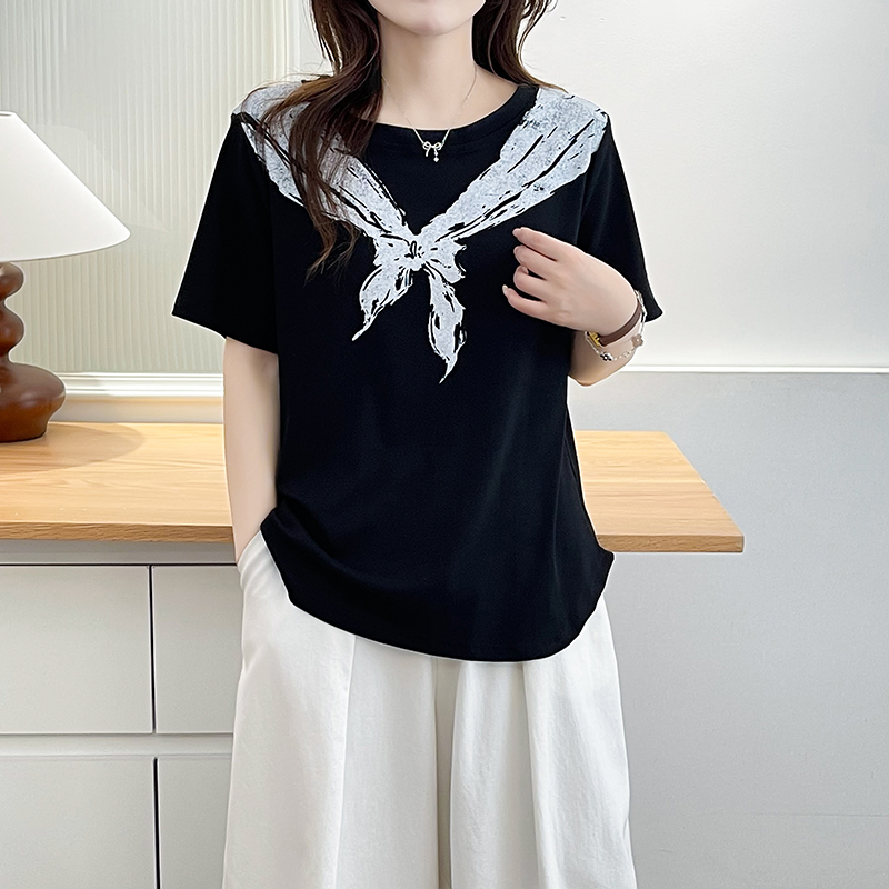 大码女装领结印花短袖T恤2025年夏季新款显瘦假海军领上衣体恤衫