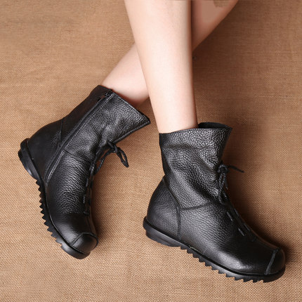 春秋真皮平底休闲复古文艺森女系带大码手工短靴女单靴软底奶奶鞋