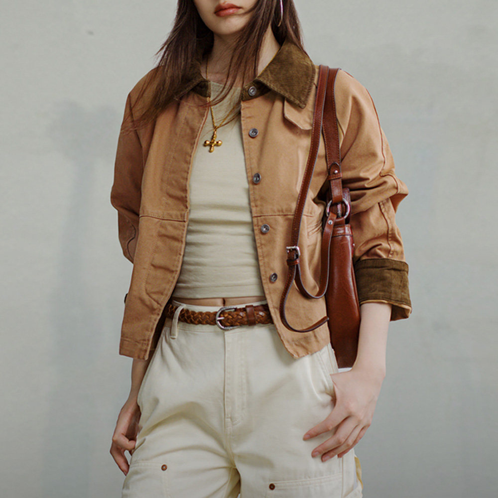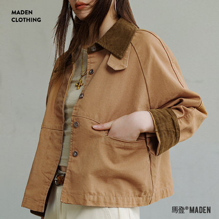 马登巴恩风美式工装圣达菲夹克灯芯绒拼接帆布外套翻领上衣春季女