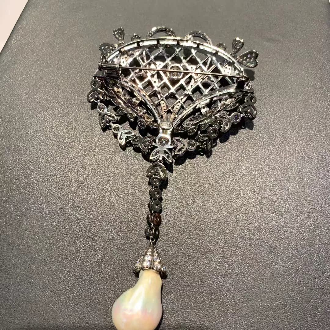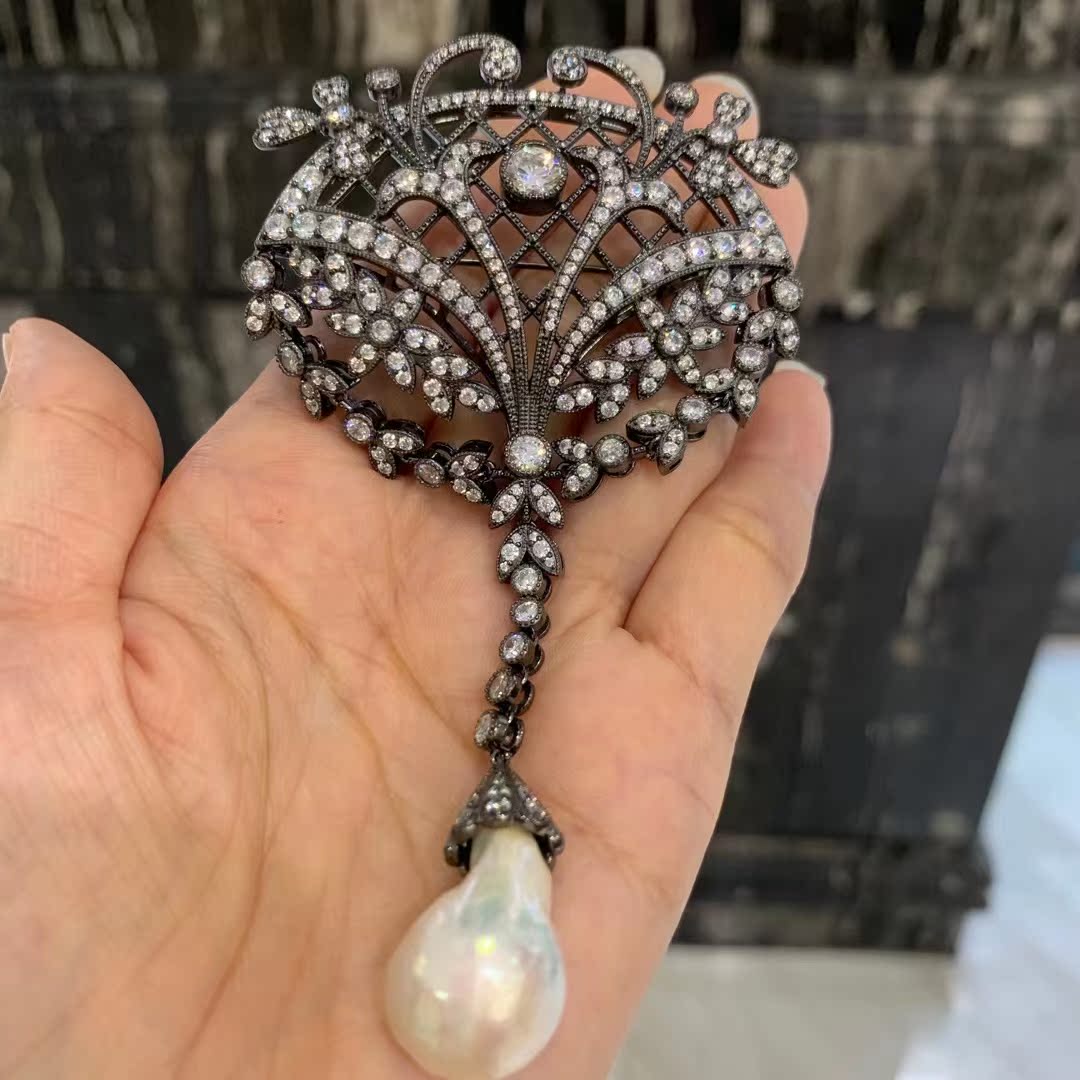 巴洛克天然淡水珍珠胸针复古古董风格925纯银精镶锆石ANLU