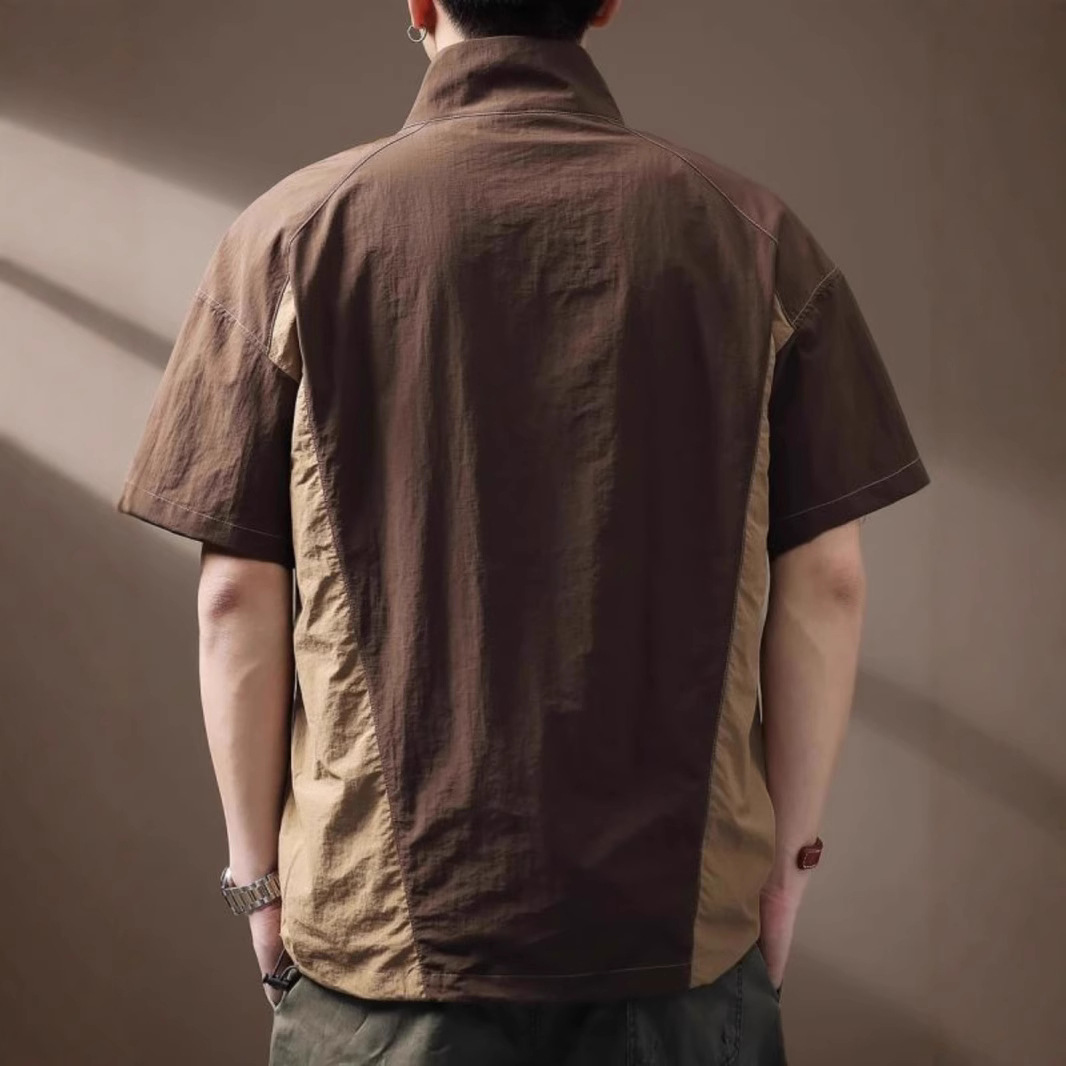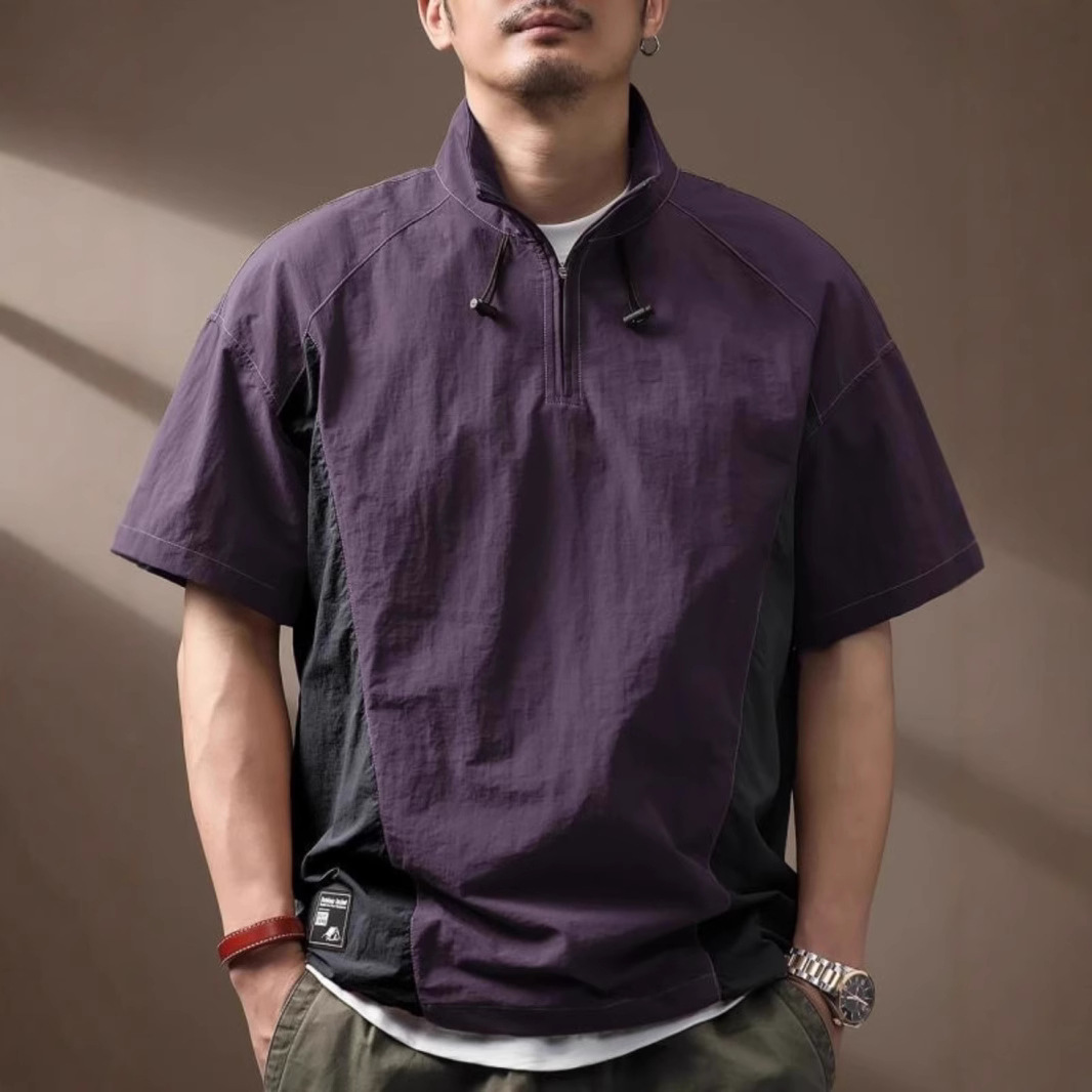 冰丝短袖t恤男士立领polo衫夏季潮牌提花拉链半袖美式速干体恤衫