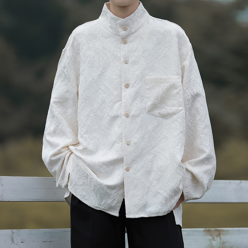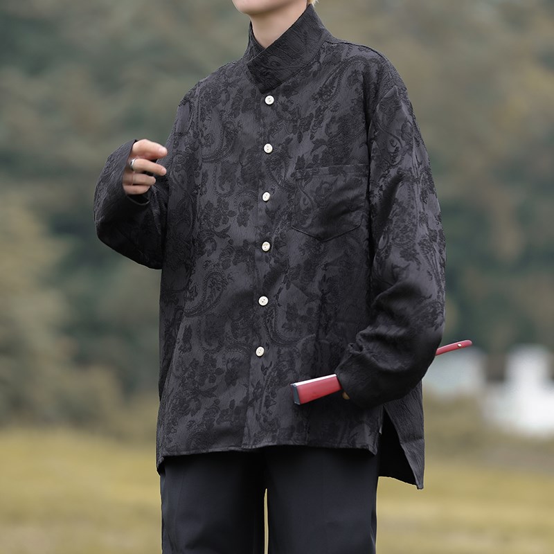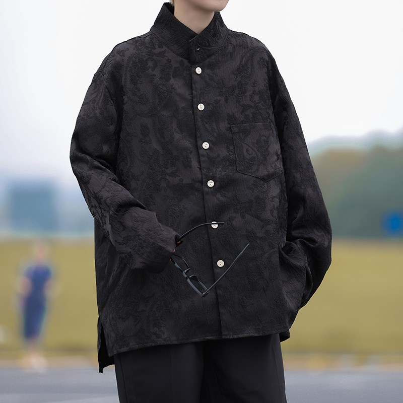 新中式肌理感提花立领长袖衬衫男士秋季复古国风宽松百搭唐装衬衣