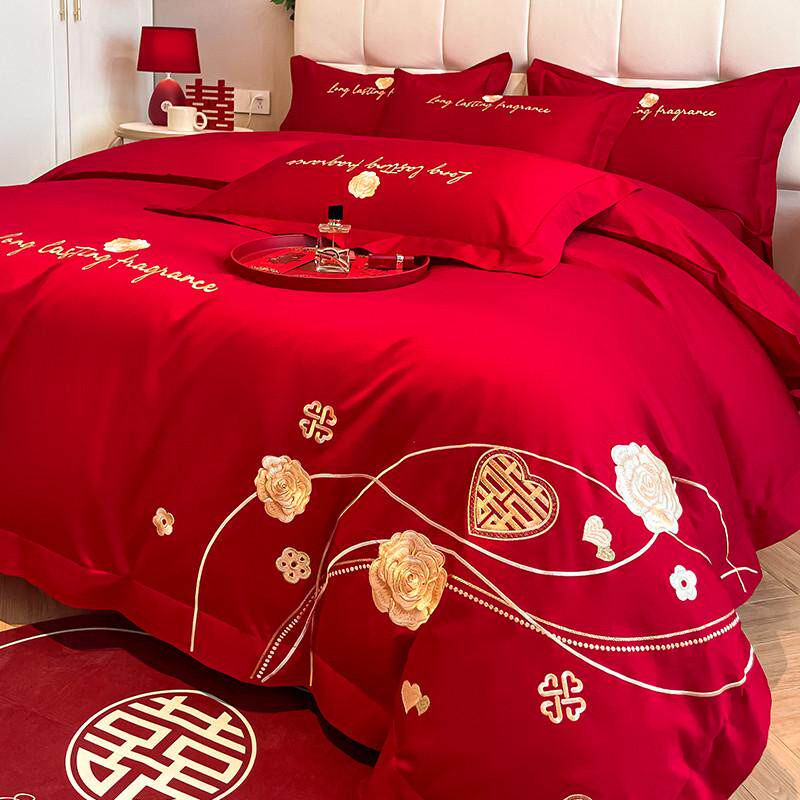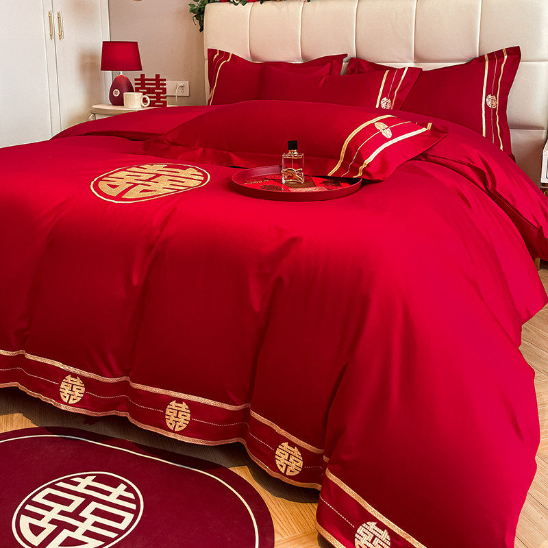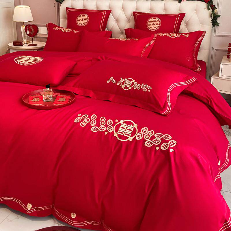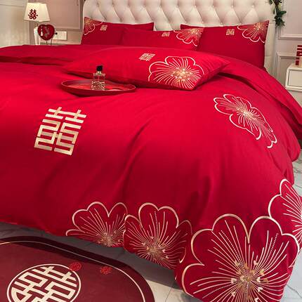 tuf4中式刺绣婚庆四件套大红色结婚陪嫁床单被套活性印染棉