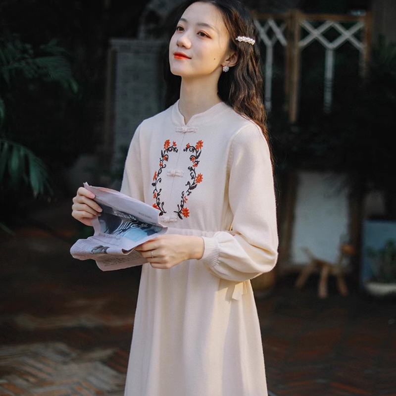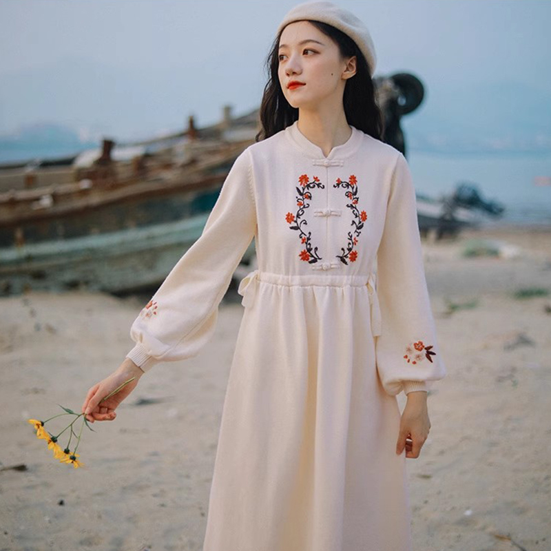 微笑向暖复古立领盘扣刺绣毛衣裙慵懒风毛衣 宽松外穿打底针织裙B