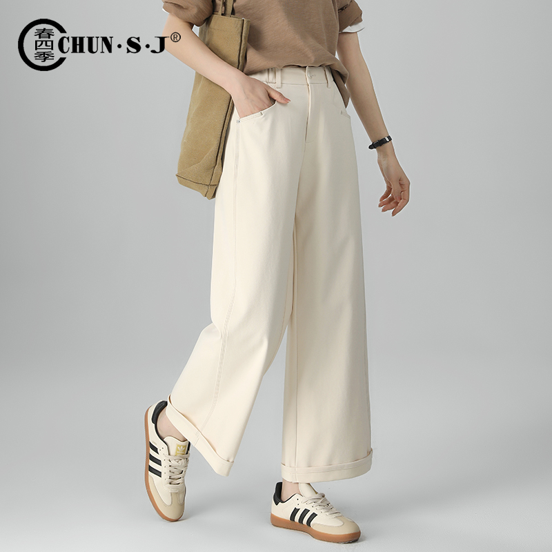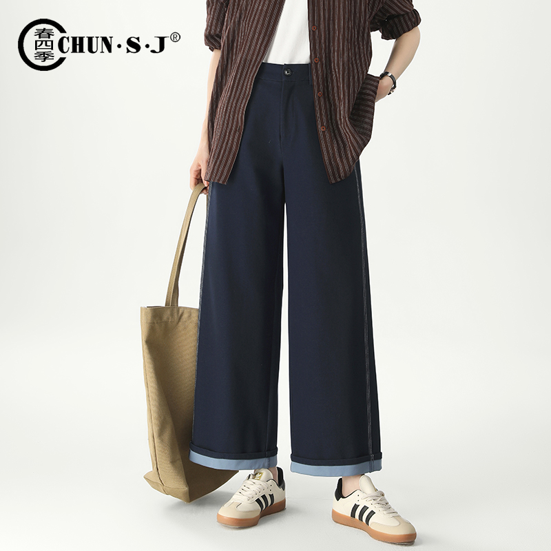 春四季藏蓝色卷边阔腿裤女休闲裤