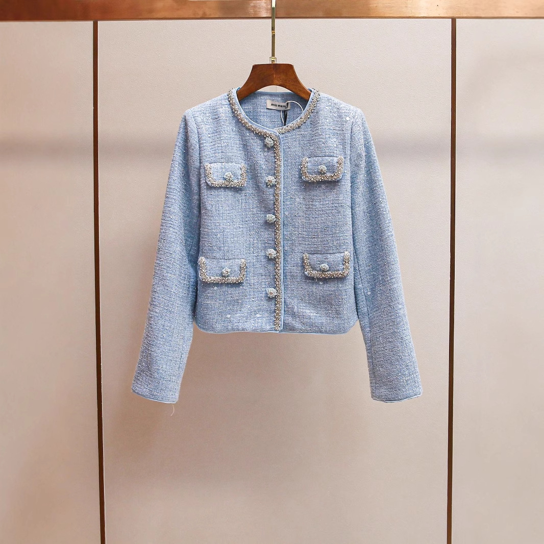 SP家小香风粗花呢亮片外套+镂空背心连衣裙+包臀短裙三件套装女
