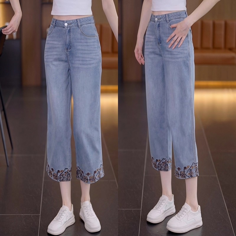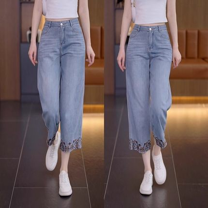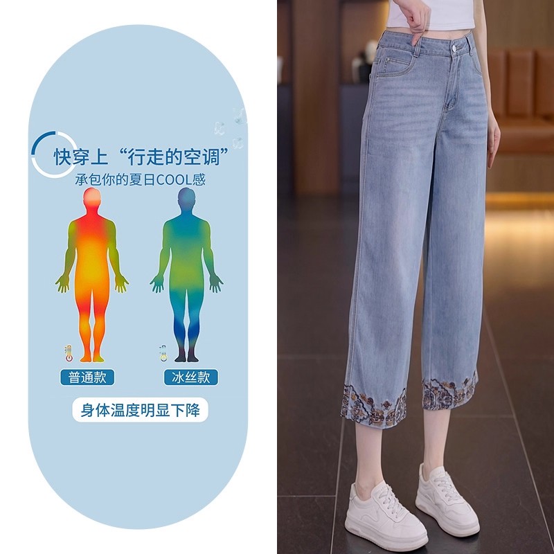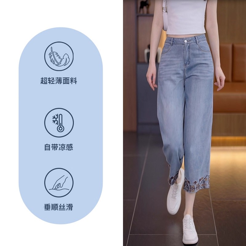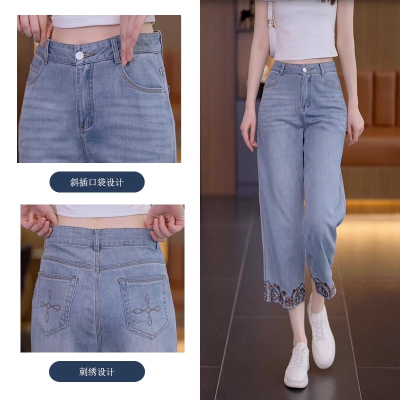 天丝八分牛仔直筒裤女夏季薄款2025新款高腰重工刺绣小个子阔腿裤
