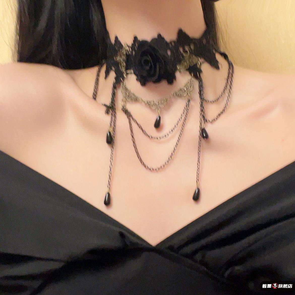 黑色蕾丝脖子配饰装饰项链女项圈流苏吊坠玫瑰花颈带choker暗黑系