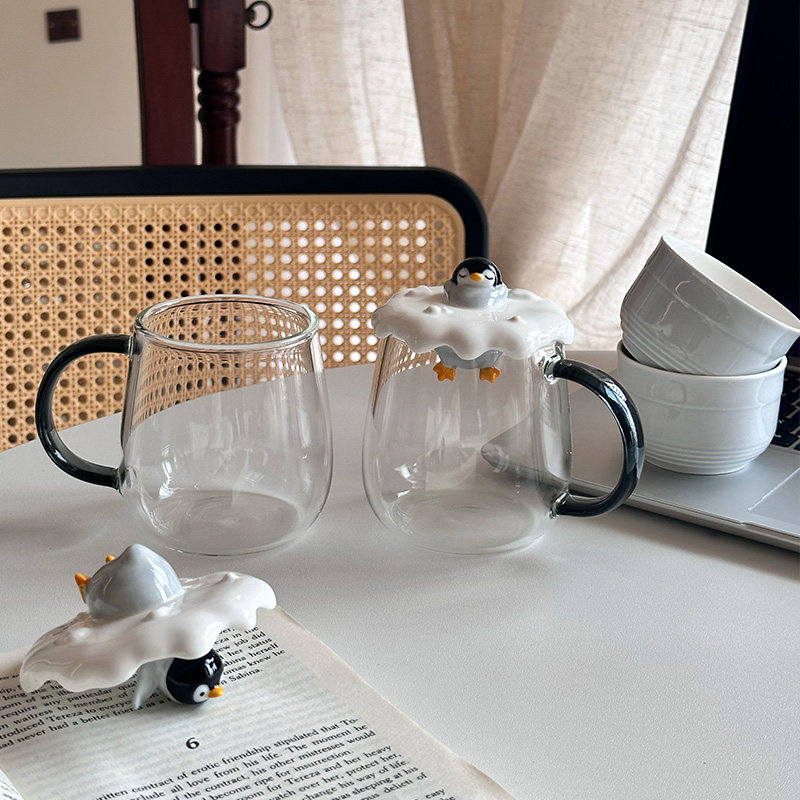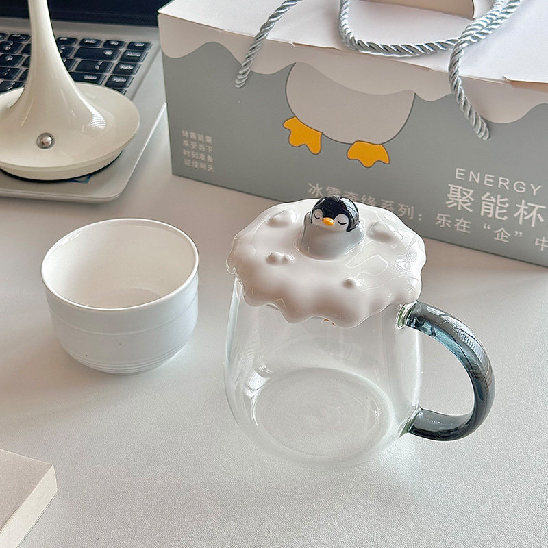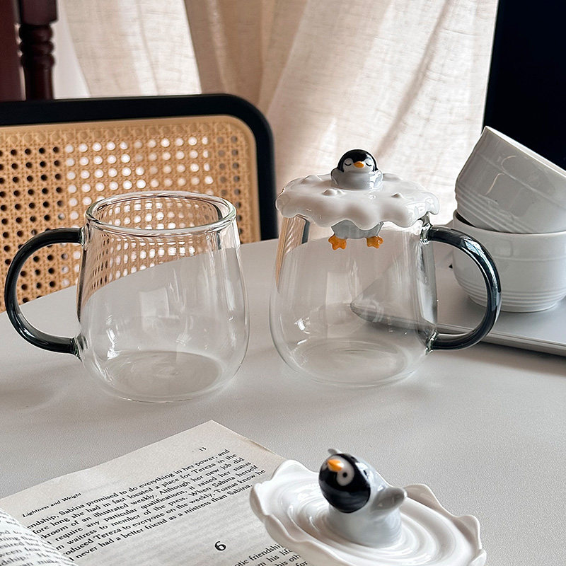 企鹅杯子耐热玻璃杯陶瓷盖子礼物