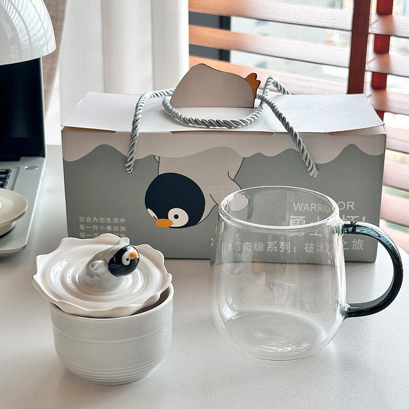 ins风企鹅杯子耐热玻璃杯情侣马克杯陶瓷带盖水杯女生日礼物礼盒