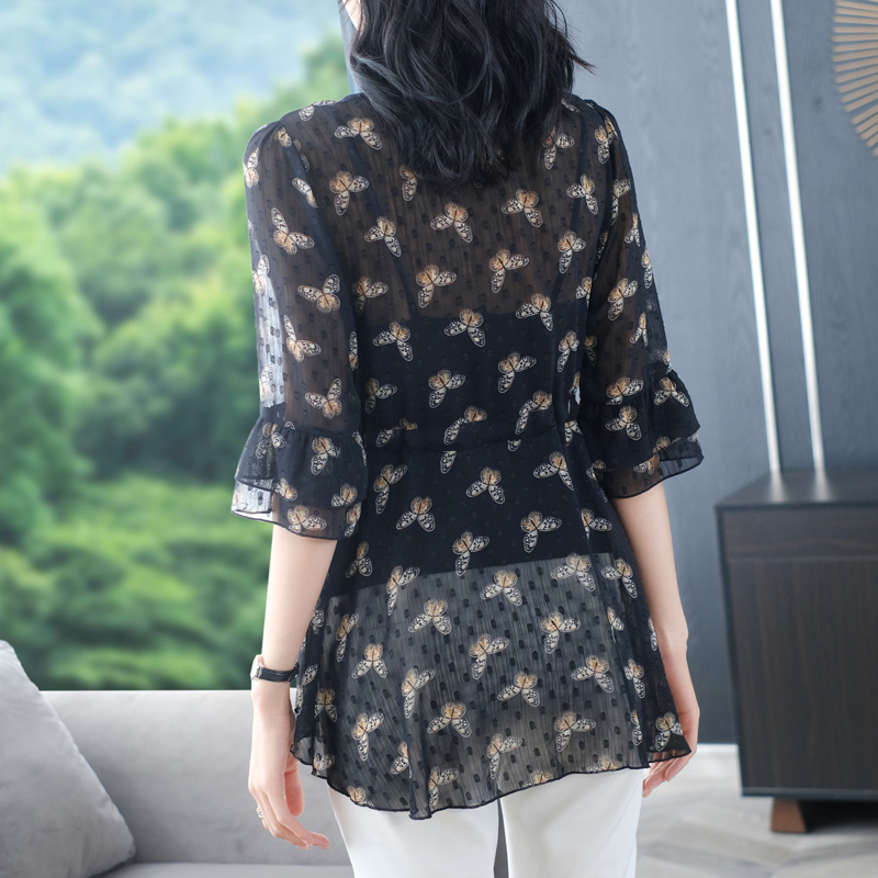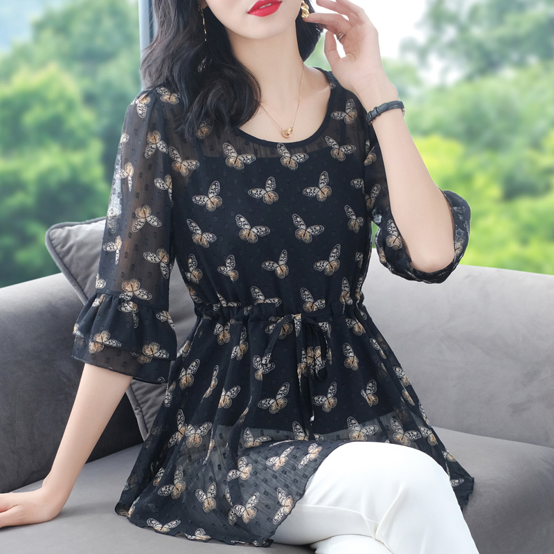 碎花雪纺衫女短袖夏季薄款大码收腰高端t恤性感遮肚子很仙气上衣