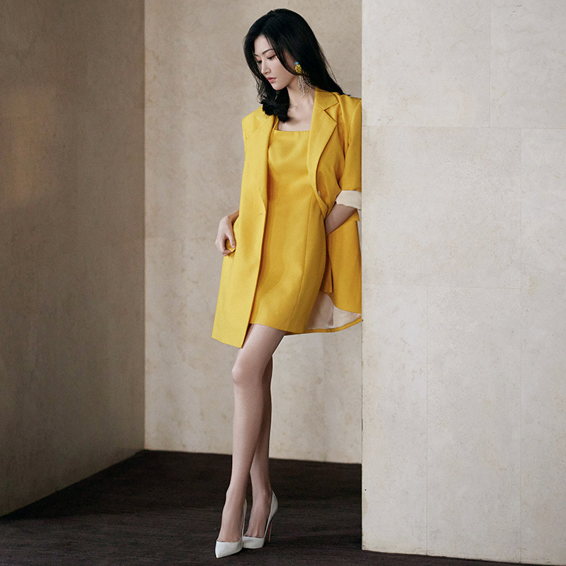 景甜柠檬黄西装2025新款直角肩翻驳领中长款廓形显瘦西服裙套装女