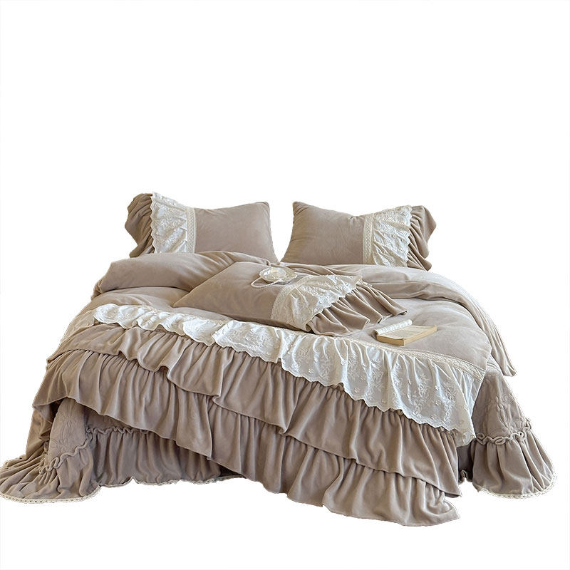 法式复古加厚牛奶绒四件套冬季珊瑚绒蕾丝花边被套公主风床裙床盖