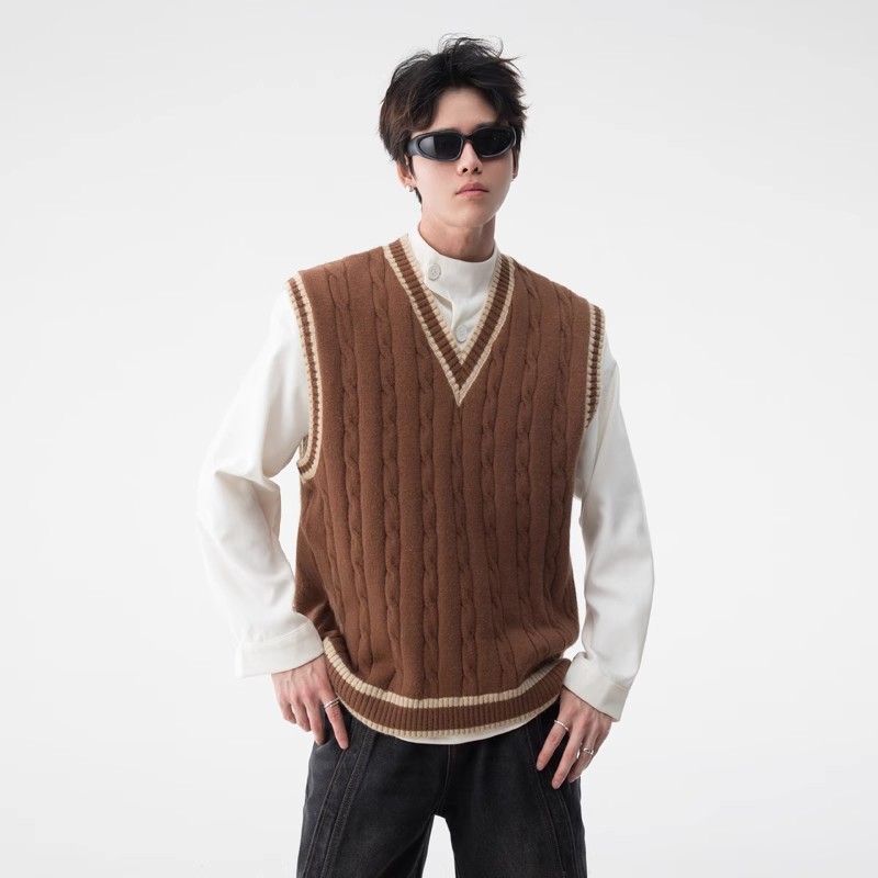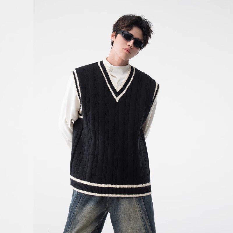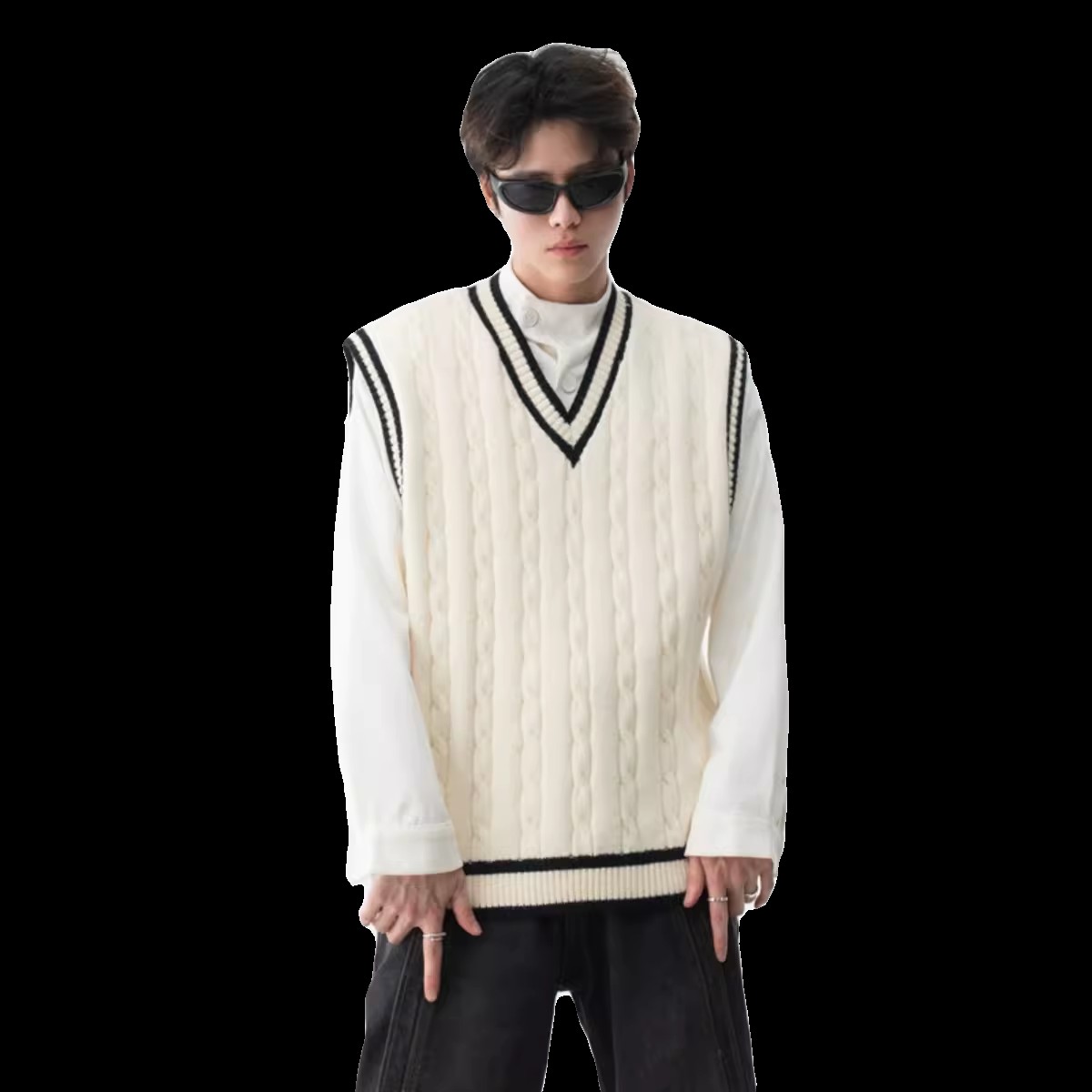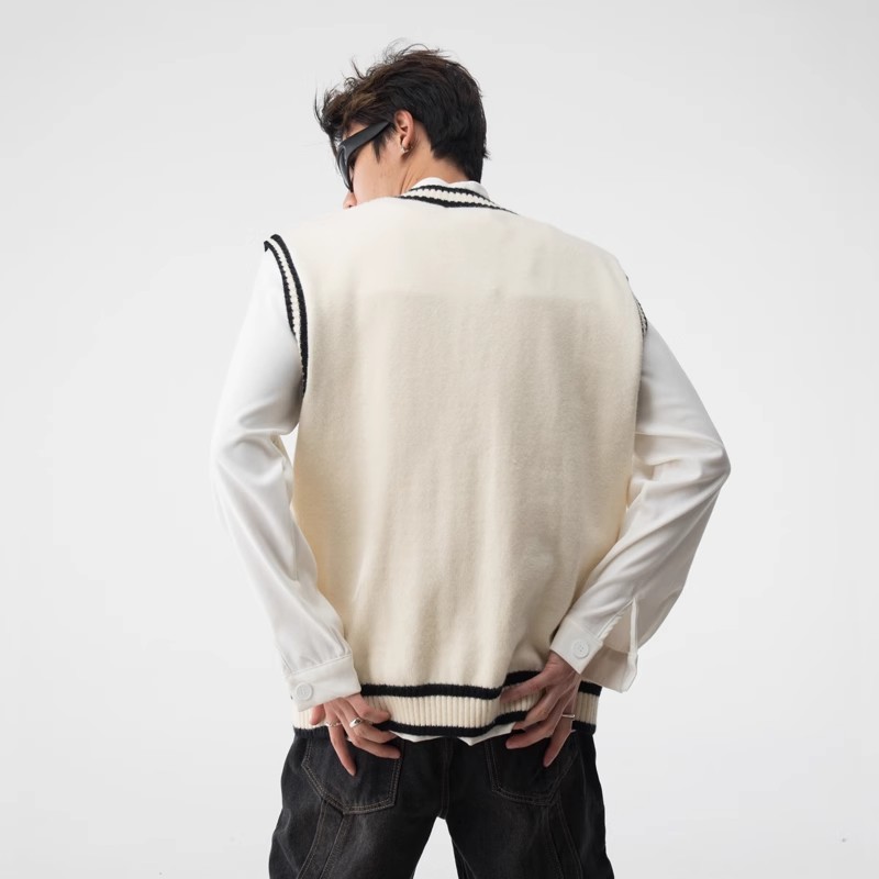 复古日系撞色V领针织衫背心男女坎肩基础款宽松小众百搭无袖毛衣