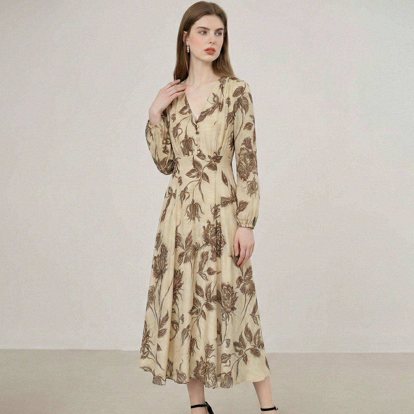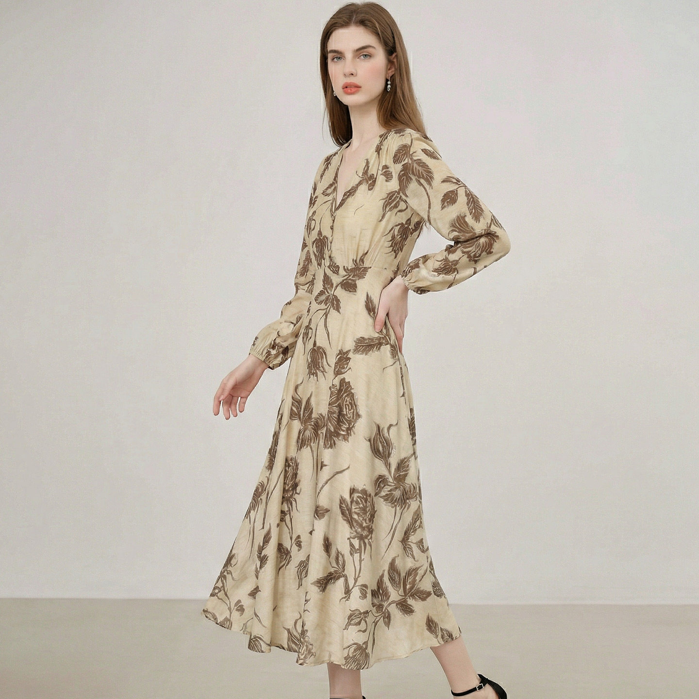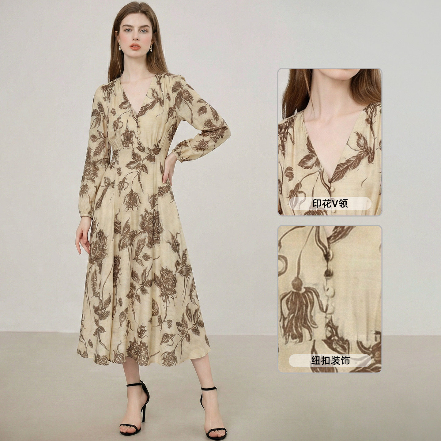 2026春季新款气质法式碎花浪漫度假风裙子长袖V领印花连衣裙女
